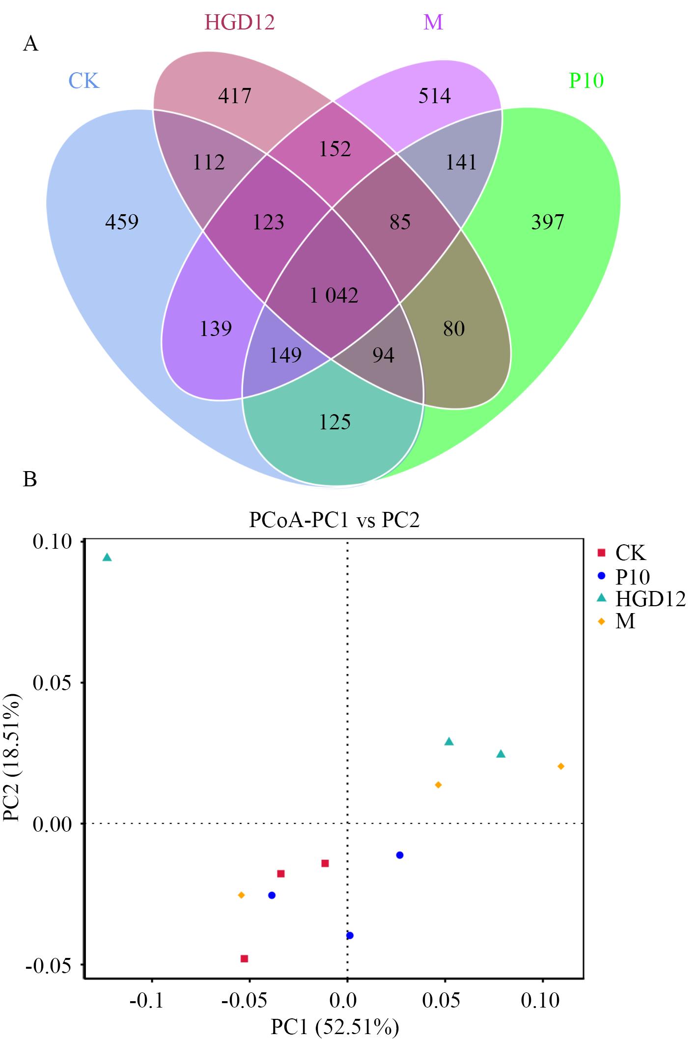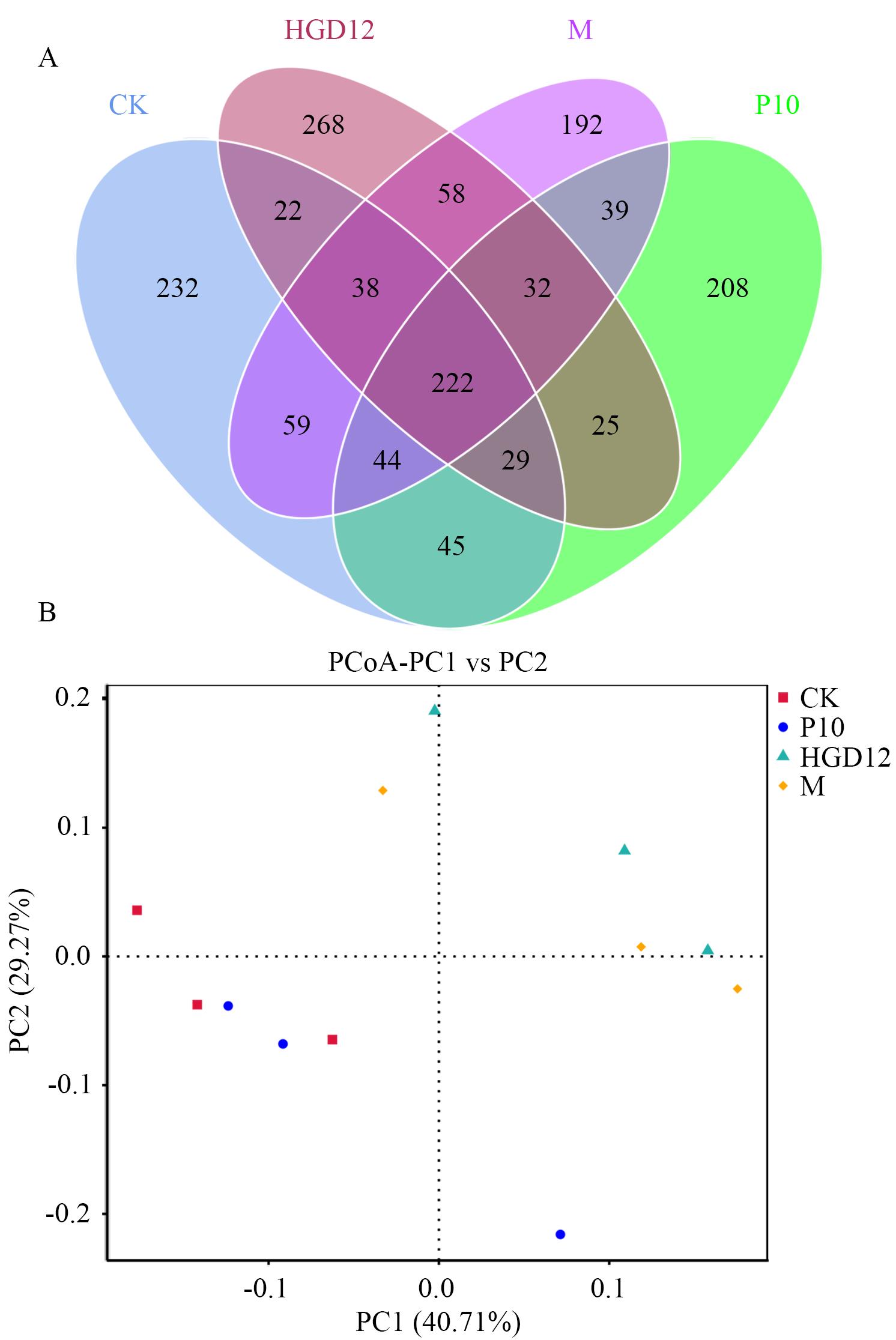 Fig. 4 Venn diagram (A) and PCoA analysis (B) of bacterial ASVs under different treatment substratesCK: Control. P10, HGD12 refers to the treatment of P10 and HGD12 strain, respectively. M: Treatment of P10+HGD12 co-fermented broth. The same below