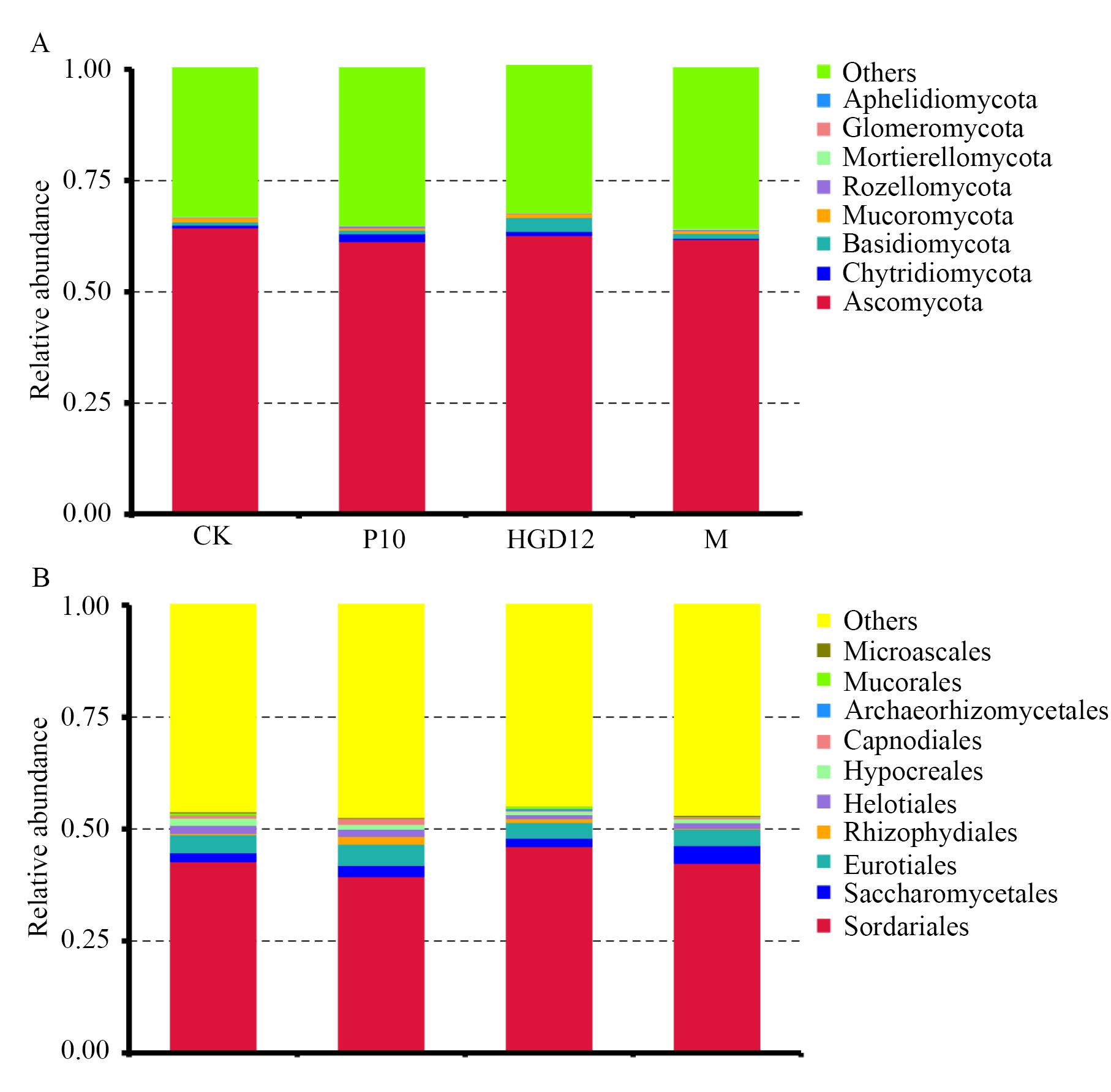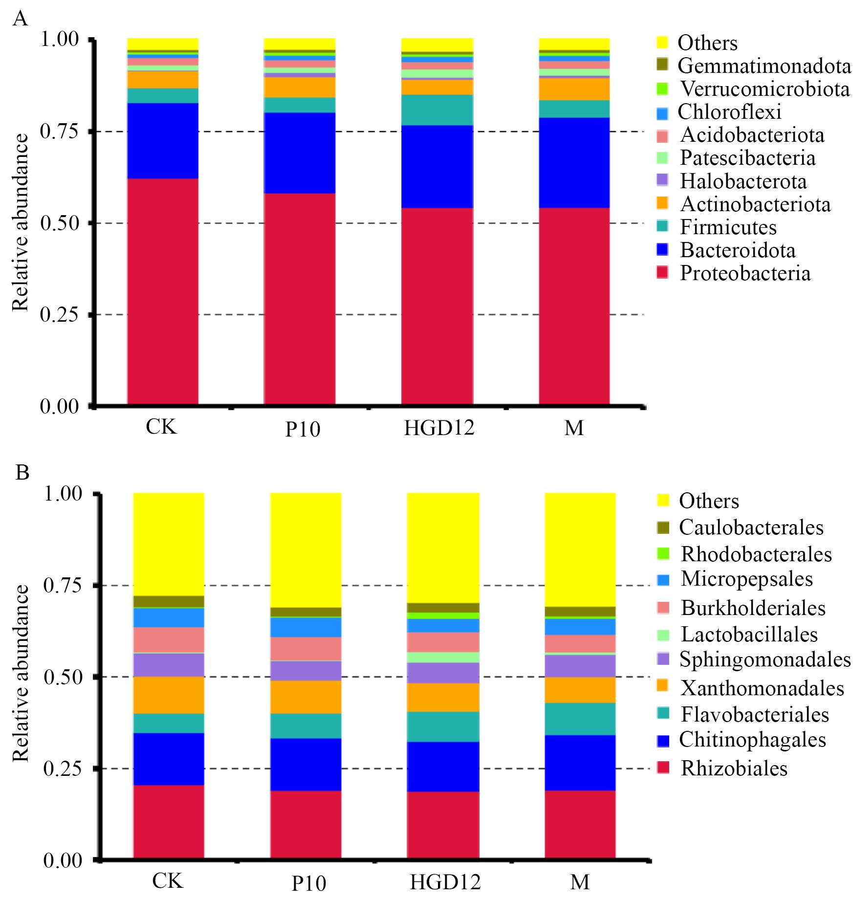 Fig. 5 The top 10 bacterial community in the abundance ranking of different treatmentsA: Phylum level. B: Order level
