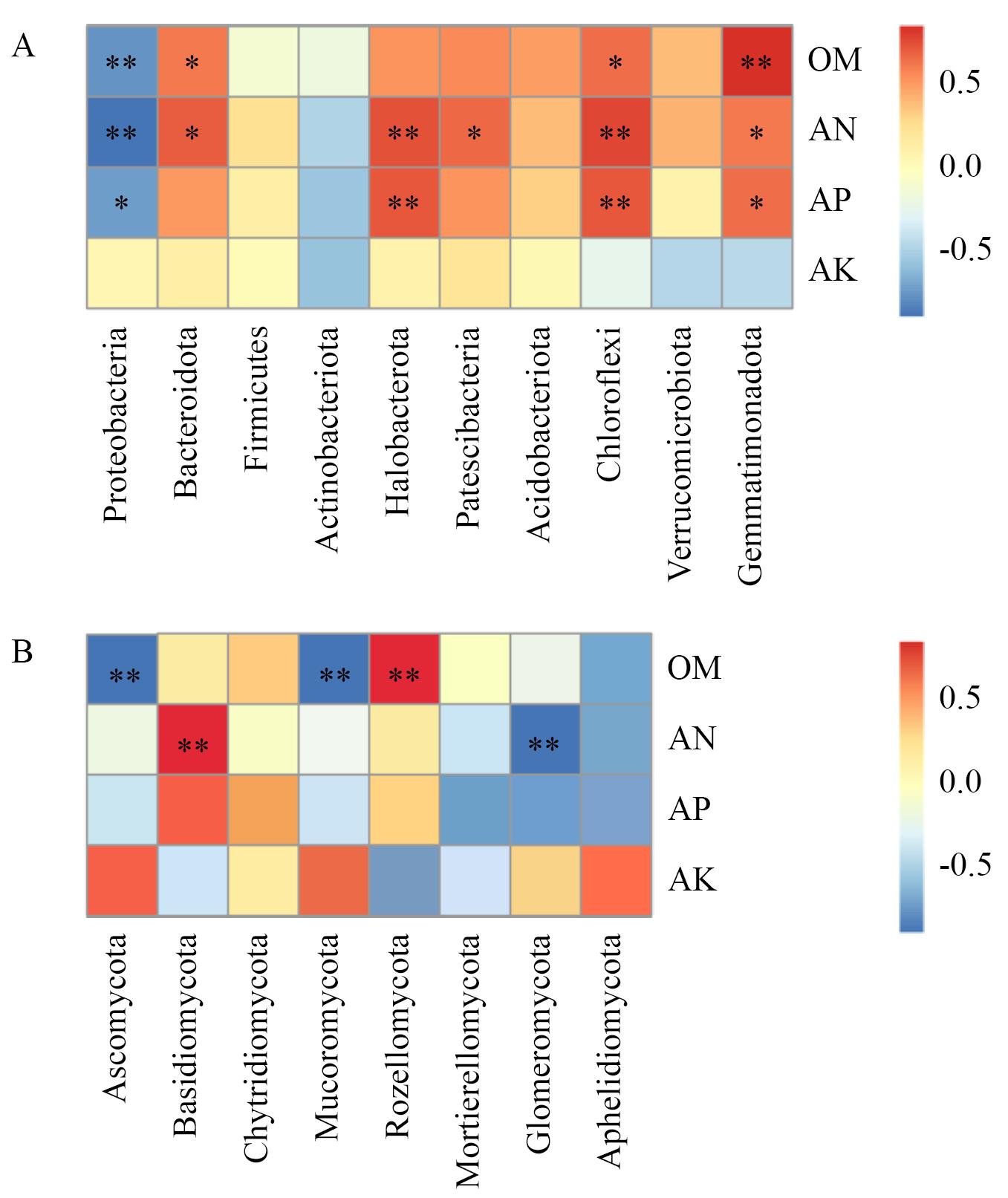 Fig. 8 Spearman analysis of environmental factors and microbial phylum at different treatmentsA: Bacterial. B: Fungal. OM, AN, AP and AK refers to organic matter, alkaline-hydrolyzed nitrogen, available phosphorus and available potassium, respectively. * P<0.05, ** P<0.01