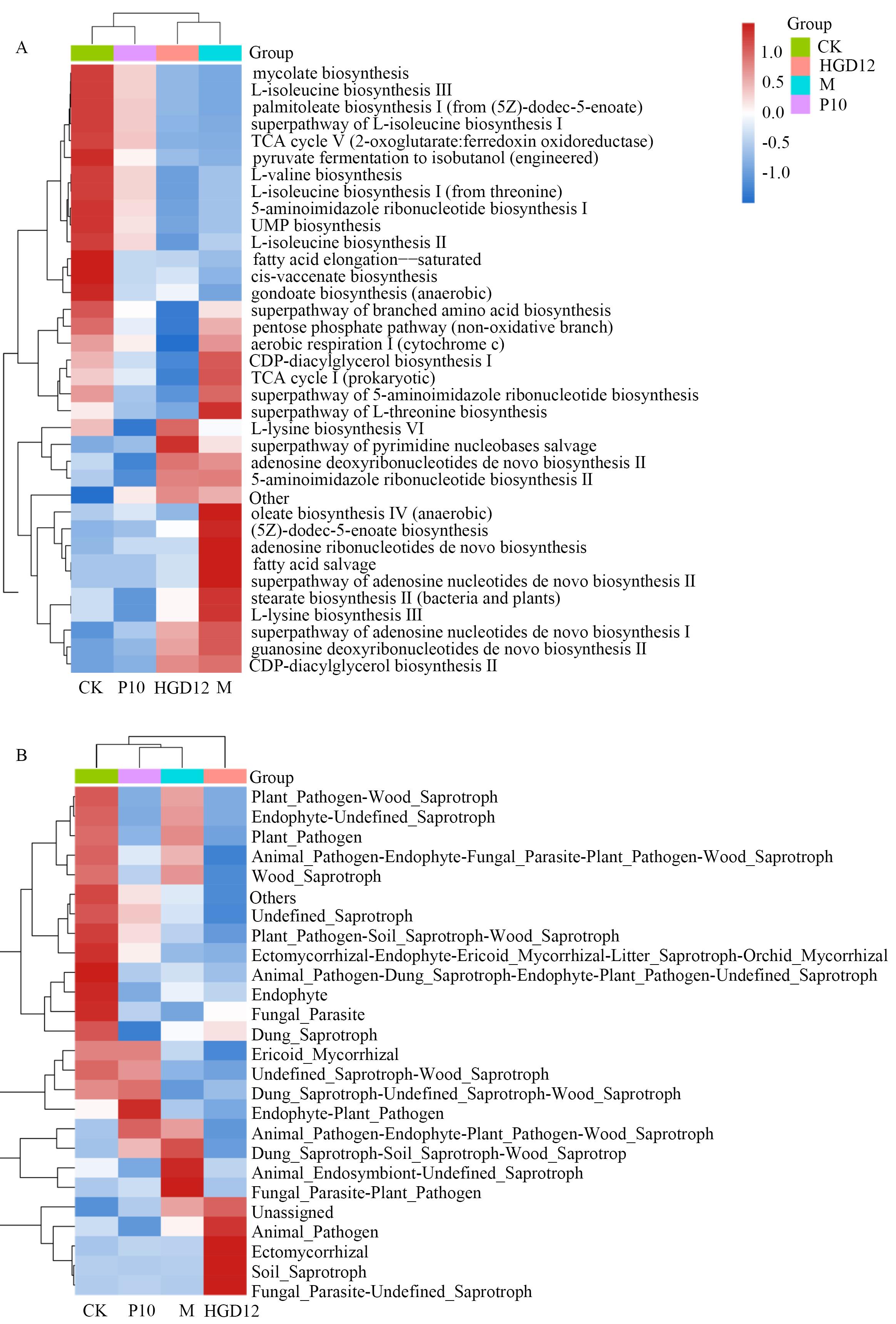 Fig. 9 Cluster heatmap of functional annotation of rhizosphere microbial communitiesA: Bacterial community. B: Fungal community. The corresponding values in the heatmap are the Z values obtained by standardizing the relative abundance of each row of functional information, with red indicating high abundance and blue indicating low abundance