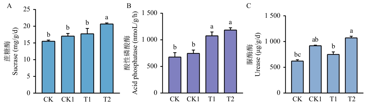 Fig. 1 Changes in the activities of sucrase (A), acid phosphatase (B), and urease (C) under different treatmentsCK: Water Control. CK1: Benzoic acid treatment. T1: Benzoic acid + strain YNK-FB0022 treatment. T2: YNK-FB0022 treatment. Different letters represent different significance (P<0.05)