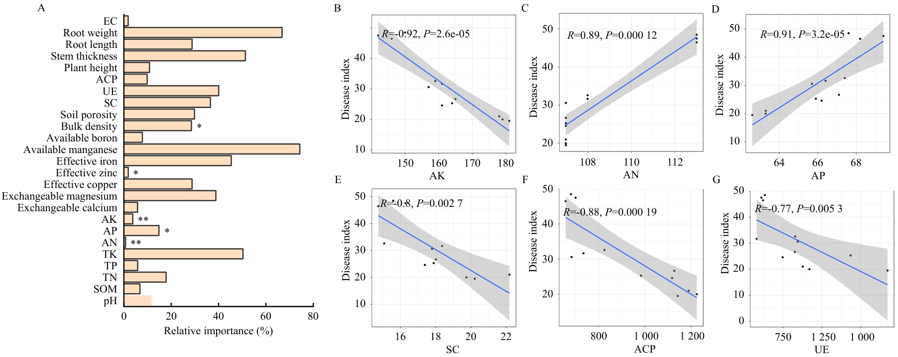 Fig. 2 Analysis of importance of different physical and chemical indexes to disease index and correlation between each index and disease indexA: Random forest analysis of physical and chemical indicators. B: Correlation between AK (available potassium) and disease index. C: Correlation between AN (Hydrolyzed nitrogen) and disease index. D: Correlation between AP (available phosphorus) and disease index. E: Correlation between SC (Sucrase) and disease index. F: Correlation between ACP (Acid phosphatase) and disease index. G: Correlation between UE (urease) and disease index