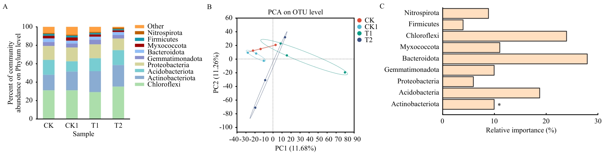 Fig. 3 Abundance of dominant phyla (A), principal component analysis of bacterial community (B) and importance of dominant phyla to disease index under different treatments (C)(P<0.05)
