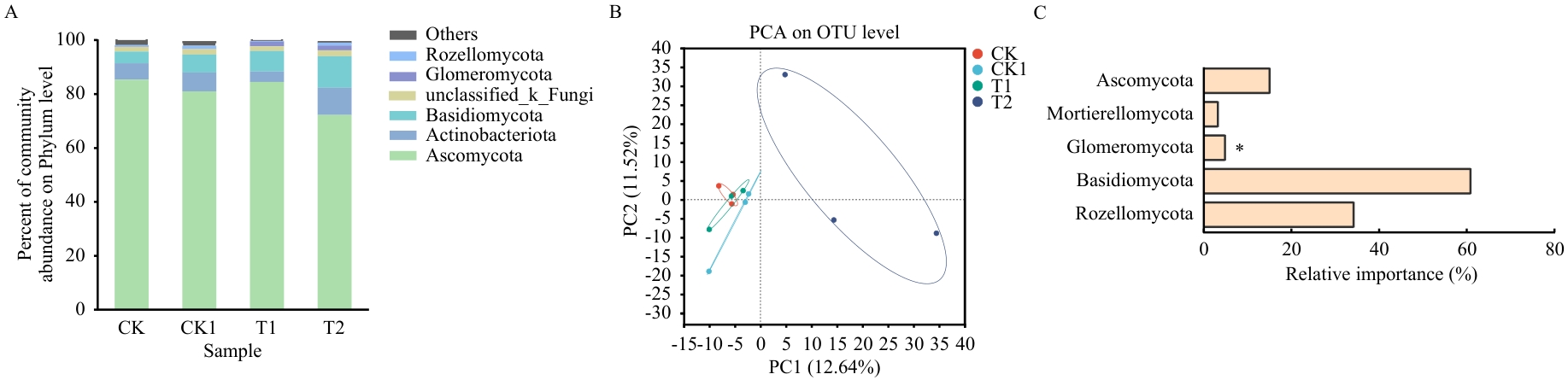 Fig. 4 Change of fungal dominant phylum abundance under different treatments (A), principal component analysis of fungal community (B), and the importance of fungal dominant phylum to disease index (C)
