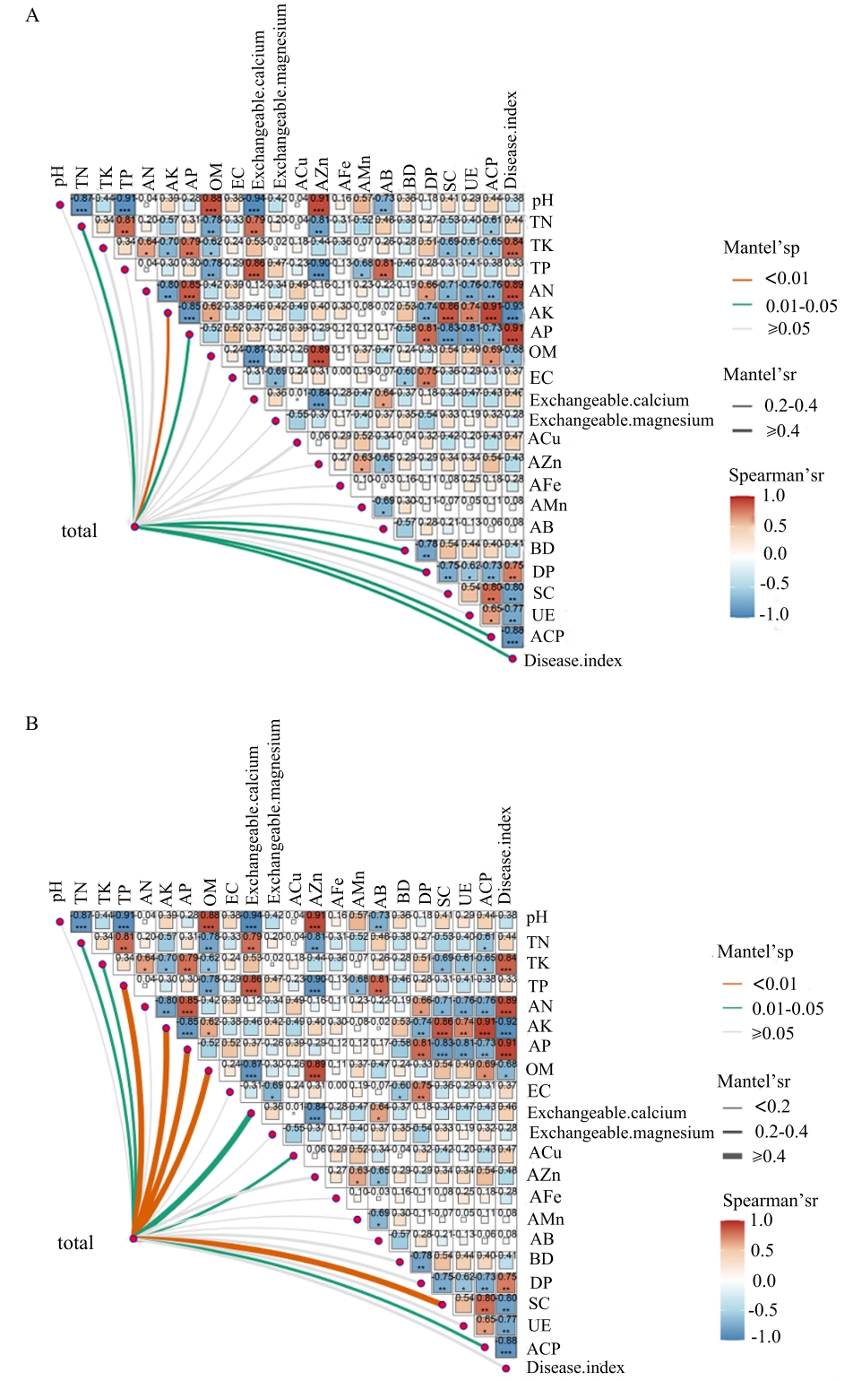 Fig. 5 Correlation analysis between soil microbial community structure and soil environmentA: Correlation analysis between bacterial community structure and soil index. B: Correlation analysis between fungal community structure and soil index