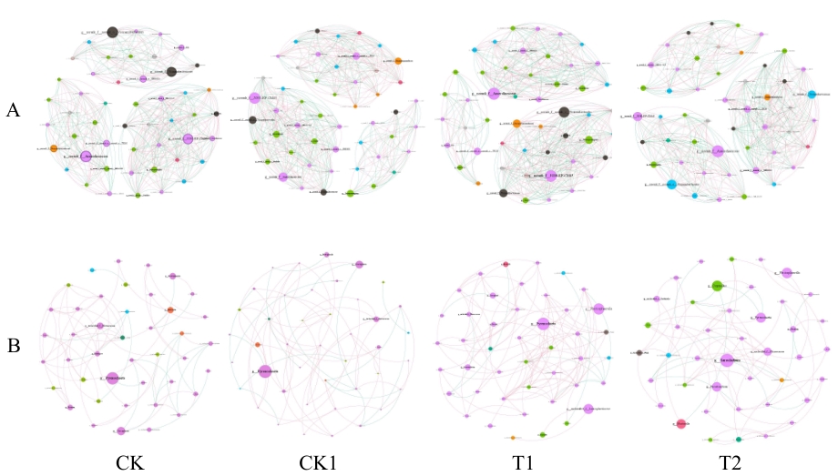 Fig. 6 Ecological network structure of microorganism under different treatmentsA: Bacterial ecological network structure. B: Fungal ecological network structure