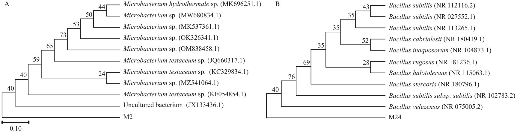 Fig. 2 Phylogenetic tree depicting the molecular identification of strains M2 and M24A:M2 strain;B:M24 strain. The values in parentheses are GenBank accession numbers. Numbers at the nodes are bootstrap values, and the scale bar indicates the nucleotide substitution rate