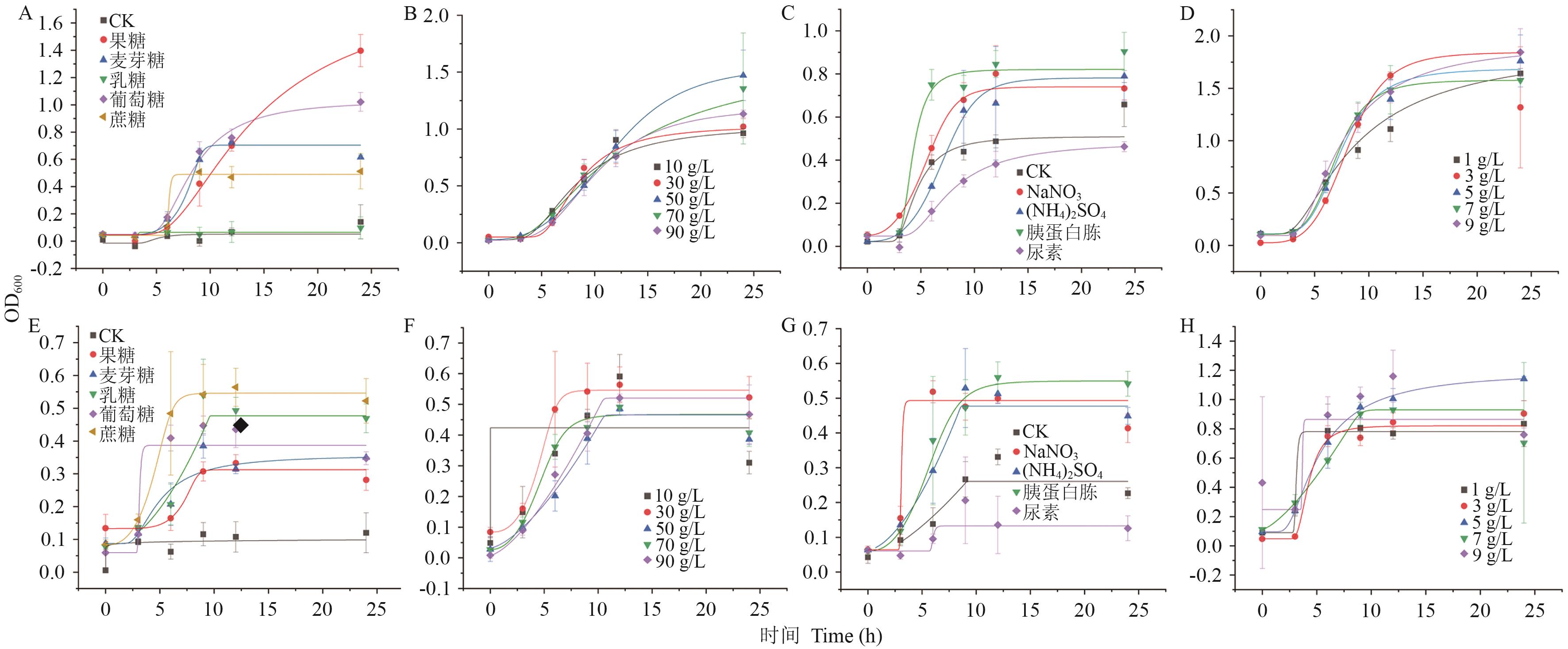 图5 菌株最适生长条件A-D:分别为M2菌株的最适碳源种类、最适碳源浓度、最适氮源种类、最适氮源浓度。E-F:分别为M24菌株的最适碳源种类、最适碳源浓度、最适氮源种类、最适氮源浓度