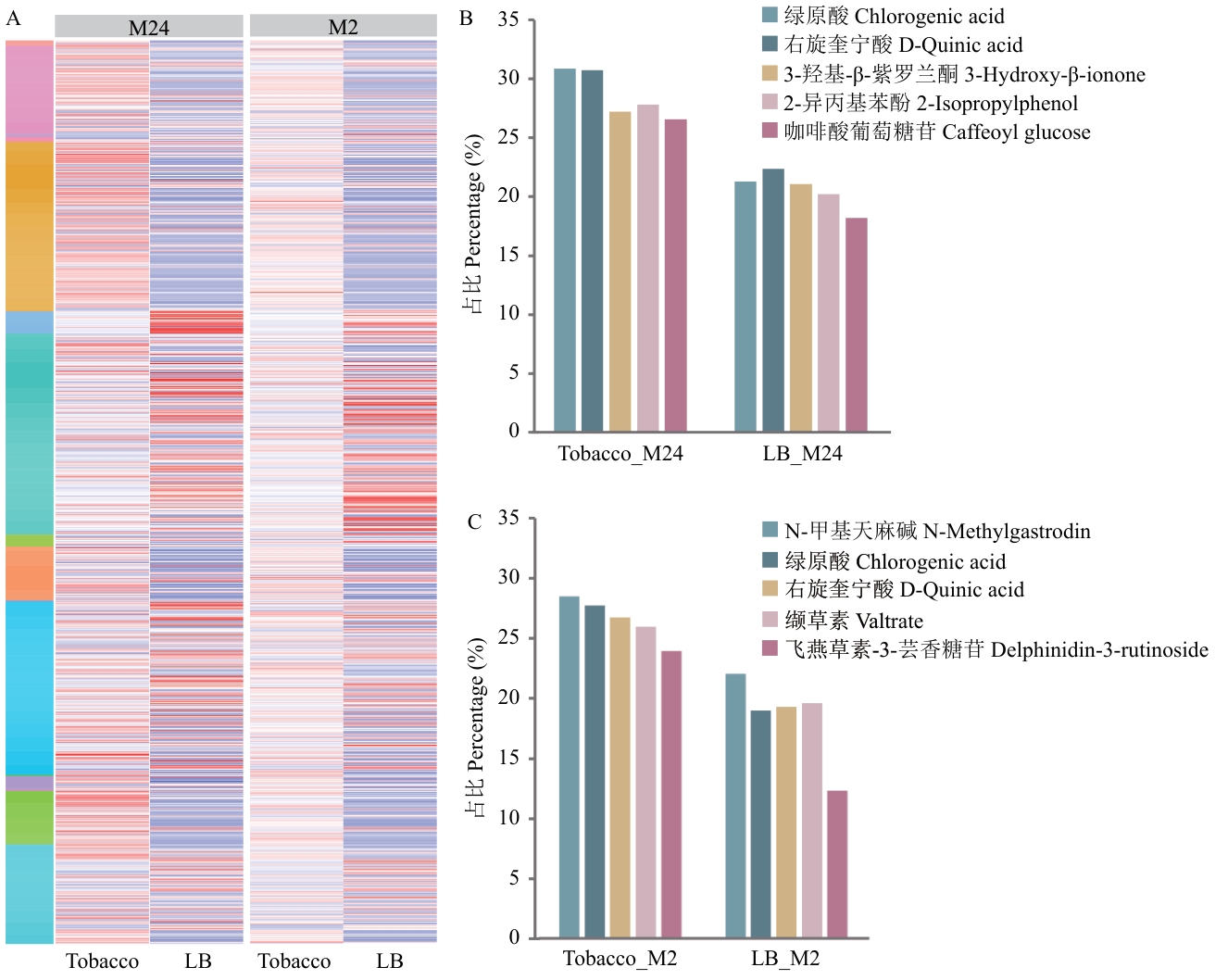 图6 不同培养基富集菌株发酵液代谢物组成A:不同培养基富集菌株发酵液代谢物聚类热图;B:M24菌株发酵液主要多酚类化合物含量;C:M2菌株发酵液主要多酚类化合物含量,占比经log2处理。Tobacco:烟叶培养基;LB:LB培养基
