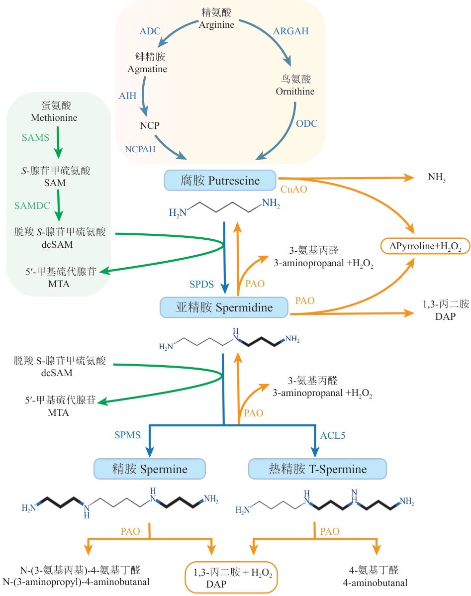 图1 多胺稳态调控网络腐胺(Put)是多胺合成的中心,Put的合成途径包括精氨酸(Arg)途径和鸟氨酸(Orn)途径。Put与dcSAM的氨丙基结合生成三胺Spd,并进一步生成四胺Spm和T-Spm。多胺的分解主要依赖于二胺氧化酶(DAO)和多胺氧化酶(PAO)。ADC:精氨酸脱羧酶;AIH:鲱精胺亚胺水解酶;NCP:N-氨甲酰腐胺;NCPAH:N-氨甲酰腐胺酰胺水解酶;ARGAH:精氨酸酶;ODC:鸟氨酸脱羧酶;SAMS:S-腺苷甲硫氨酸合成酶;SAMDC:S-腺苷甲硫氨酸脱羧酶;SPDS:亚精胺合成酶;SPMS:精胺合成酶;ACL5:热精胺合成酶;PAO:多胺氧化酶;CuAO:铜胺氧化酶;ΔPyrroline:吡咯啉