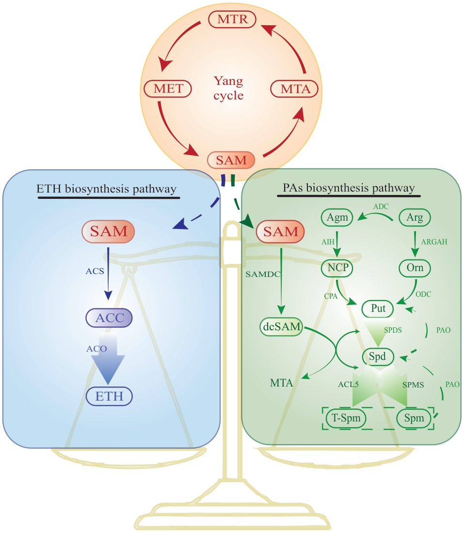 Fig. 2 Homeostatic regulation of polyamine and ethylene contents in fruitsThe polyamine and ethylene synthesis pathways regulate the dynamic changes of polyamine and ethylene contents in plants by competing for the common substrate S-adenosylmethionine (SAM), and maintaining this dynamic balance is crucial for the development and ripening processes of fruits. MET: Methionine. SAM: S-adenosylmethionine. MTA: 5′-methylthioadenosine. MTR: 5′-methylthioribose. ACS: ACC synthase. ACC: 1-aminocyclopropane-1-carboxylic acid. ACO: ACC oxidase. ETH: Ethylene. ADC: Arginine decarboxylase. AIH: Agmatine iminohydrolase. NCP: N-carbamoylputrescine. ARGAH: Arginase. ODC: Ornithine decarboxylase. Arg: Arginine. Orn: Ornithine. Agm: Agmatine. SAMDC: S-adenosylmethionine decarboxylase. SPDS: Spermidine synthase. SPMS: Spermine synthase. ACL5: Thermospermine synthase. PAO: Polyamine oxidase. SPDS: Spermidine synthase. SPMS: Spermine synthase. Put: Putrescine. Spd: Spermidine. Spm: Spermine