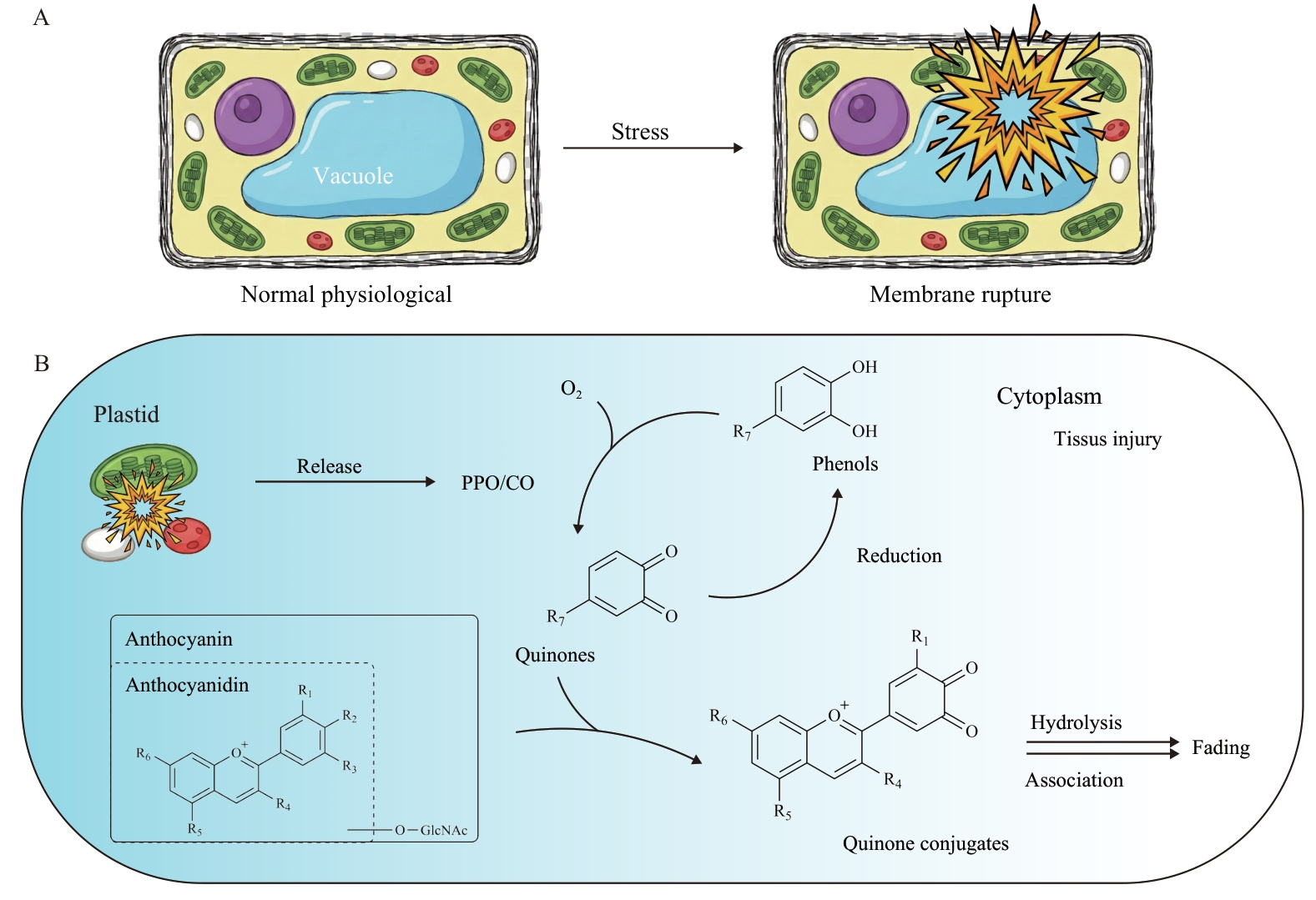 Fig. 1 Schematic representation of cytoplasmic anthocyanin degradation triggered by tissue injuryA: Under various stress conditions, the disruption of cellular membrane integrity leads to the breakdown of membrane systems, resulting in the release of plastid-localized PPO/CO into the cytoplasm. B: The released PPO/CO catalyzes the oxidation of free phenolic substrates to generate reactive quinone intermediates, which form conjugates with anthocyanins. These conjugates subsequently undergo hydrolysis and polymerization, ultimately causing tissue discoloration. Moreover, the quinone intermediates can be rapidly reduced back to phenolic substrates, establishing a redox cycle that facilitates efficient anthocyanin degradation in the cytoplasm. PPO/CO: Catechol oxidase belonging to the polyphenol oxidase family