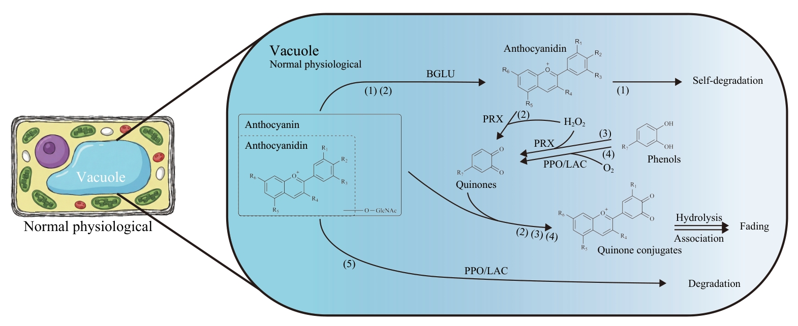 Fig. 2 Proposed schematic model illustrating enzymatic degradation pathways of anthocyanins in the vacuole under normal physiological conditionsUnder normal physiological conditions, anthocyanins sequestered in the vacuole undergo enzymatic degradation through multiple degradation routes. 1) Anthocyanins are hydrolyzed by BGLU to generate anthocyanidins, which are inherently unstable and prone to spontaneous decomposition. 2) Anthocyanidins generated by BGLU are further oxidized to quinones by PRX, which then couple with anthocyanins to form quinone conjugates, leading to anthocyanin degradation through hydrolysis or polymerization. 3) 4) Free phenol compounds present in the vacuole are oxidized to quinones by PRX and PPO/LAC, which then mediate anthocyanin degradation by a coupling reaction similar to the pathway 2). 5) Anthocyanins are directly oxidatively degraded by PPO/LAC. BGLU: β-glucosidase; PRX: Peroxidase; PPO/LAC: the laccase belonging to the polyphenol oxidase family