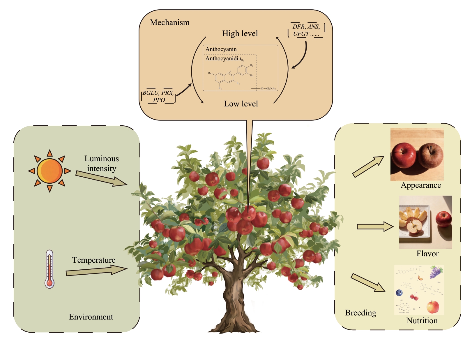图3 环境因子调控果实花色苷代谢及育种应用示意图光照、温度作为影响果实花色苷积累的关键环境因子,可通过协同调控花色苷生物合成通路与降解途径中关键基因的表达水平,精准调控果实花色苷积累量。其中,DFR、ANS和UFGT等花色苷生物合成关键结构基因,其表达量上调可显著促进花色苷积累;而BGLU、PRX和PPO等花色苷降解酶相关基因,其表达量上调则会加速花色苷分解代谢进程。花色苷合成与降解代谢过程在转录调控层面协同响应光照、温度等环境信号的变化,二者之间的动态平衡共同维持果实花色苷代谢稳态。解析环境因子协同调控花色苷合成与降解的分子机制,不仅可为研发以色泽改良为核心的品质调控技术提供理论依据,也可为果实品质性状的遗传改良提供新思路。DFR:二氢黄酮醇4-还原酶;ANS:花色素合成酶;UFGT:UDP葡萄糖-类黄酮3-O-葡糖基转移酶;BGLU:β-葡萄糖苷酶;PRX:过氧化物酶;PPO:多酚氧化酶