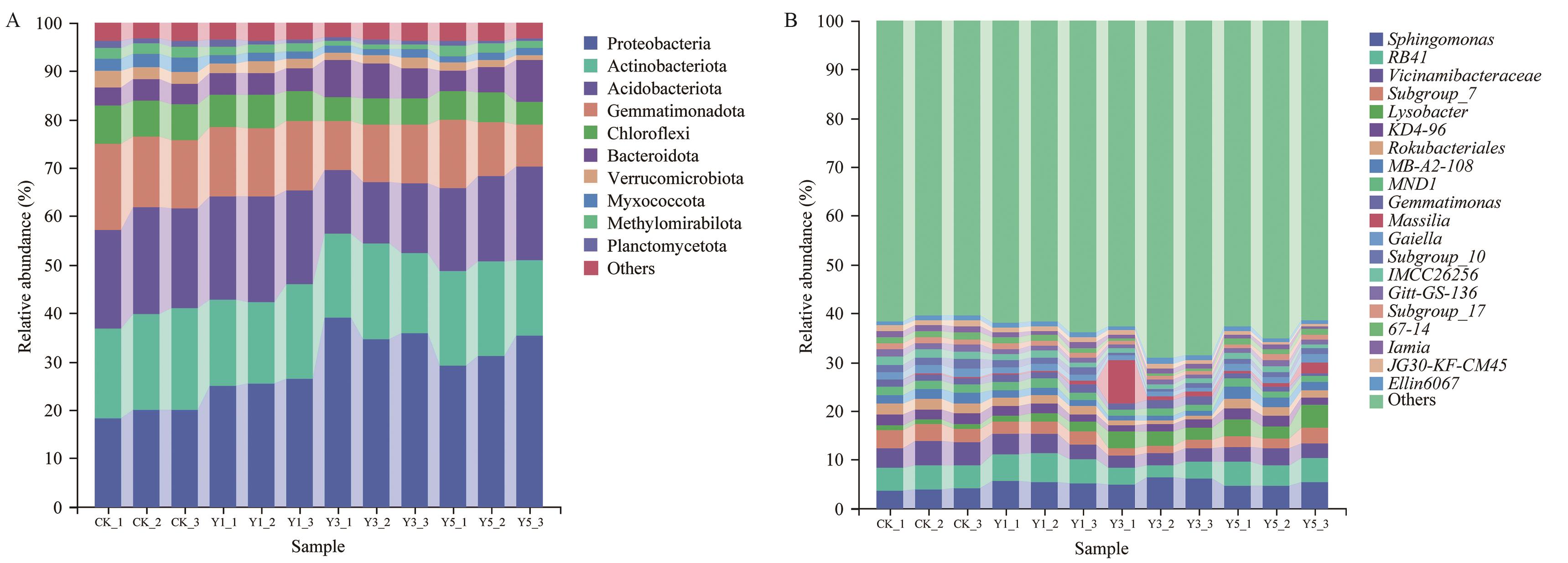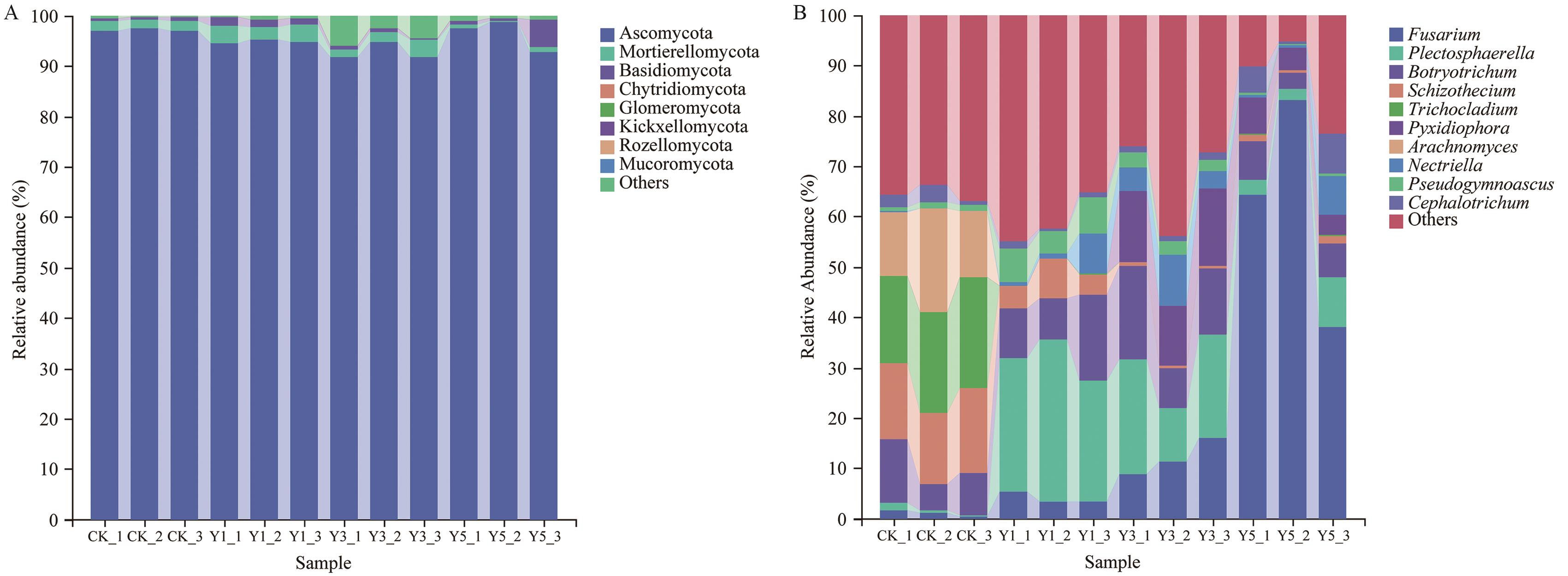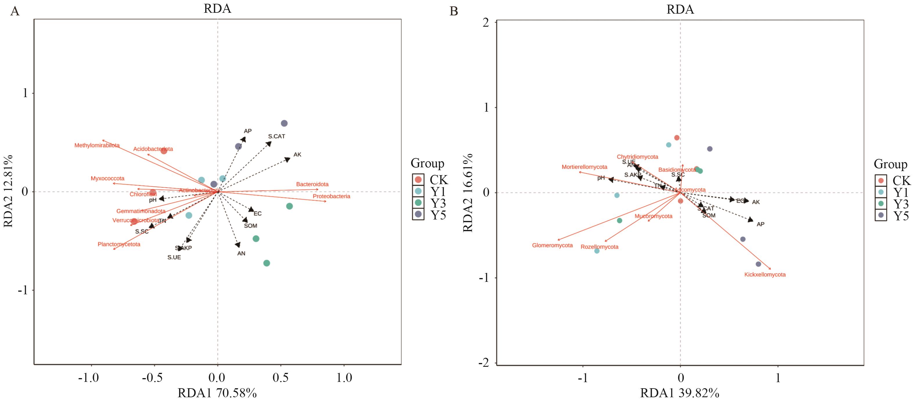 目的 探明不同种植年限对黄芪根际土壤性质及微生物群落结构的影响,揭示导致黄芪连作障碍的关键因子与微生物群落演变之间的互作机制,为探索缓解黄芪连作障碍的微生态调控途径提供理论依据。 方法 采用Illumina NovaSeq高通量测序法和常规分析方法,分析不同种植年限对土壤性质及根际土壤微生物群落多样性影响。 结果 (1)随种植年限增加,黄芪根际土壤pH值显著下降,有效磷、速效钾含量显著增加。种植5年后,过氧化氢酶显著升高,脲酶和蔗糖酶显著下降。(2)黄芪根际土壤细菌和真菌α-多样性指数均呈下降趋势,细菌群落中鞘氨醇单胞菌属(Sphingomonas)、溶杆菌属(Lysobacter)的相对丰度显著增加,真菌群落中镰刀菌属(Fusarium)等潜在致病菌相对丰度显著增加。连作导致土壤细菌和真菌微生物网络稳定性下降。连作5年黄芪根际土壤细菌群落之间的关系以拮抗为主。子囊菌门在真菌共生网络中占主导地位。(3)pH、有效磷、速效钾、碱解氮、脲酶和碱性磷酸酶对细菌群落组成相对丰度影响显著。pH、有效磷、碱解氮、脲酶对真菌群落多样性影响显著。 结论 黄芪连作通过改变土壤理化性质、酶活性及微生物群落结构与互作关系,导致微生物多样性下降、病原菌增殖和网络稳定性减弱,最终引发连作障碍。