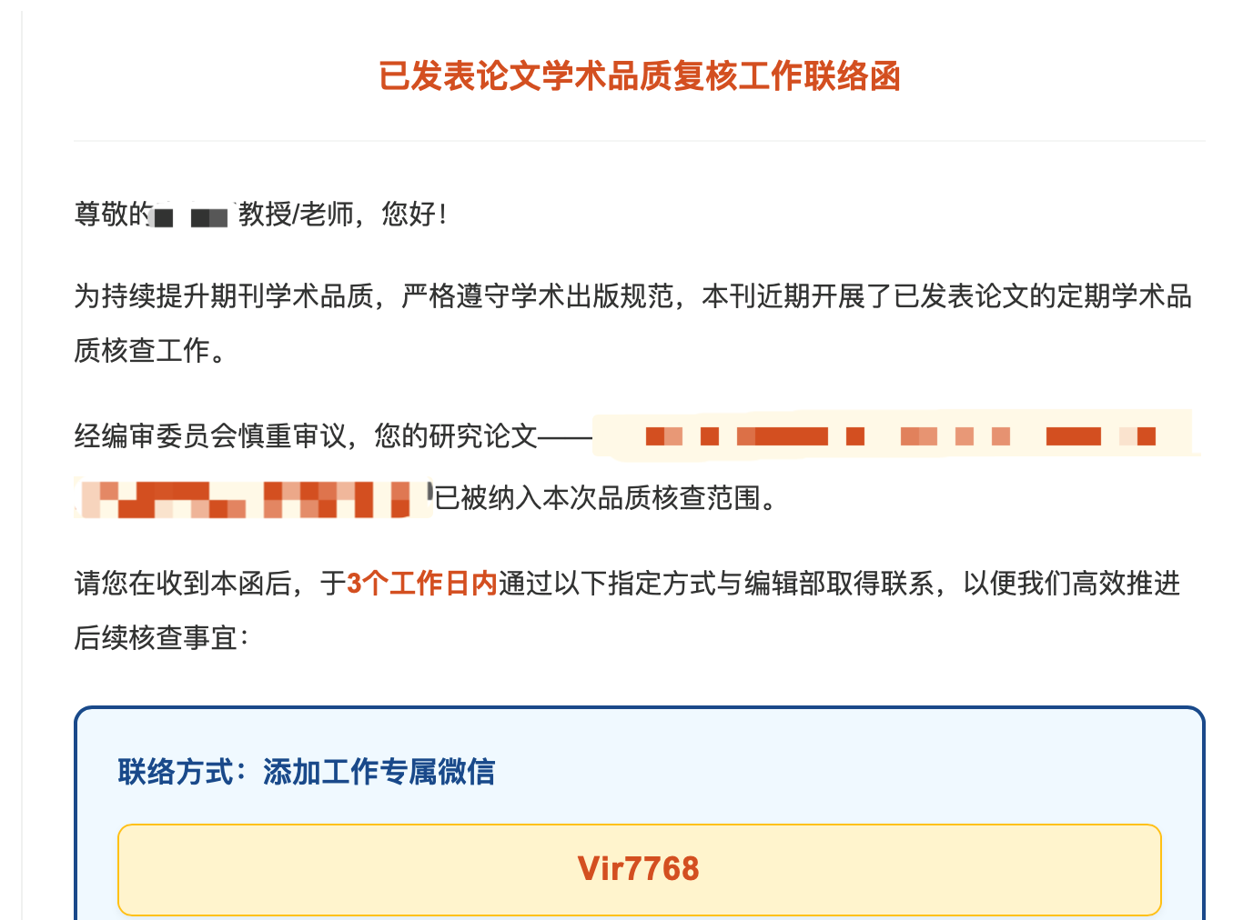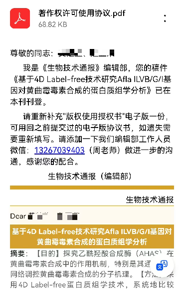 近期,《生物技术通报》编辑部发现有不法分子冒用本编辑部名义,伪造“《生物技术通报》关于已发表文章信息核对的通知”、“已发表论文学术品质复核工作联络函”、“请重新补充‘版权使用授权书’电子版”等不实信息传播。