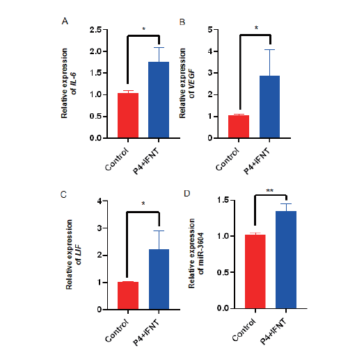 Fig. 1 Expressions of cell receptivity marker genes and miR-3604 in bEECs receptivity models A, B and C: Expressions of receptive marker genes IL-6, VEGF, and LIF. D: Expression of miR-3604, *P <0.05, **P <0.01, the same below