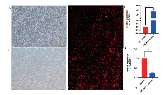Fig. 2 Overexpression and interference efficiency detection of miR-3604 in bEECs A, B, C and D: Fluorescence observation of bEECs transfected with miR-3604(100×); E: mimic transfection efficiency; F: inhibitor transfection efficiency