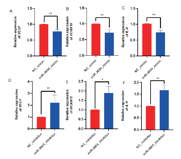 Fig. 3 Effect of miR-3604 on the expression of receptivity marker gene in bEECs A, B and C: The expressions of VEGF, HOXA10, and IL-6 in the miR-3604 overexpression group. D, E and F: The expressions of VEGF, HOXA10, and IL-6 in the miR-3604 inhibitor group