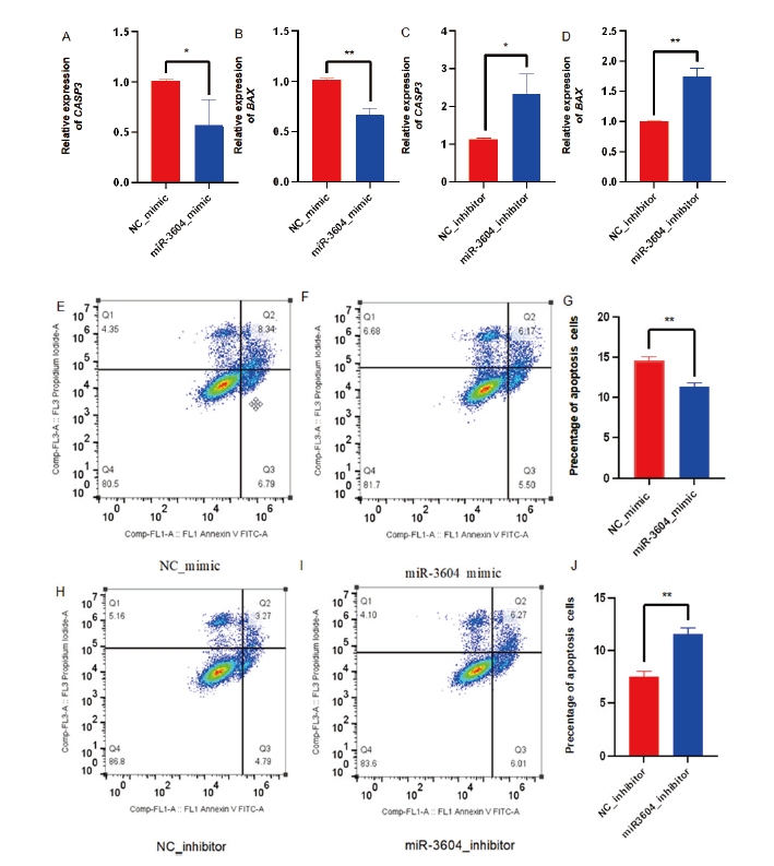 Fig. 4 Effect of miR-3604 on the apoptosis of receptive bEECs A-D: Expressions of CASP3 and BAX genes related to cell apoptosis detected by RT-qPCR. E-J: Cell apoptosis rate detected by flow cytometry