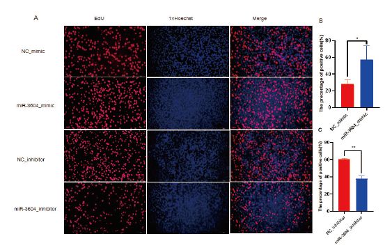 Fig. 5 Effect of miR-3604 on the proliferation of receptive bEECs A: Fluorescence observation of proliferating cells. B and C: Percentage of EdU positive cells