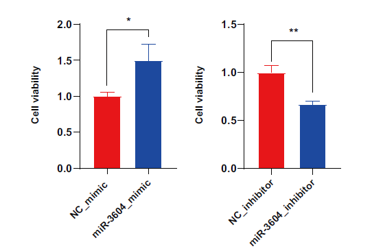 Fig. 6 Effects of miR-3604 on the viability of the receptive bEECs A: Effect of miR-3604 overexpression on the viability of bEECs. B: Effect of miR-3604 interference on the viability of bEECs