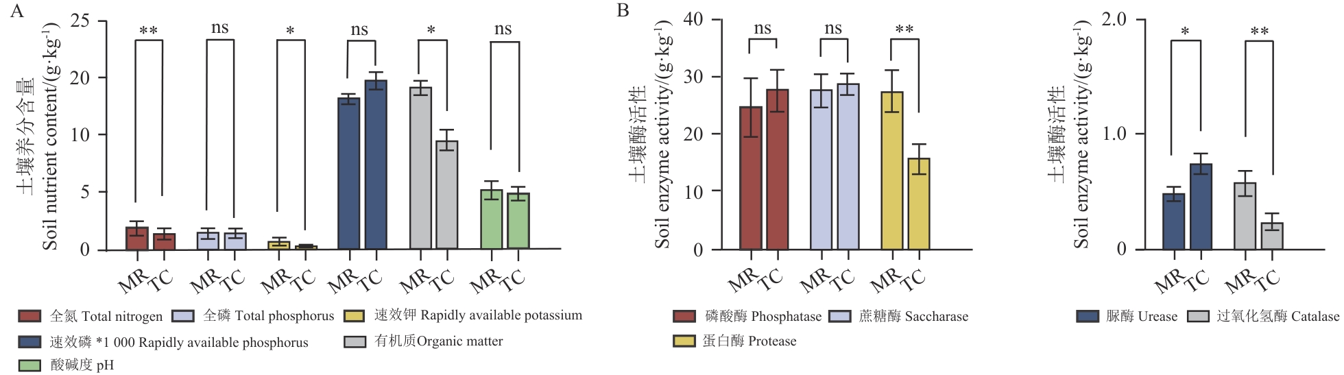 Fig. 1 Differences in soil nutrients and enzyme activities under different planting patternsMR: Corn-tobacco rotation. TC: Tobacco continuous cropping. *: P<0.05; **: P<0.01. The same below