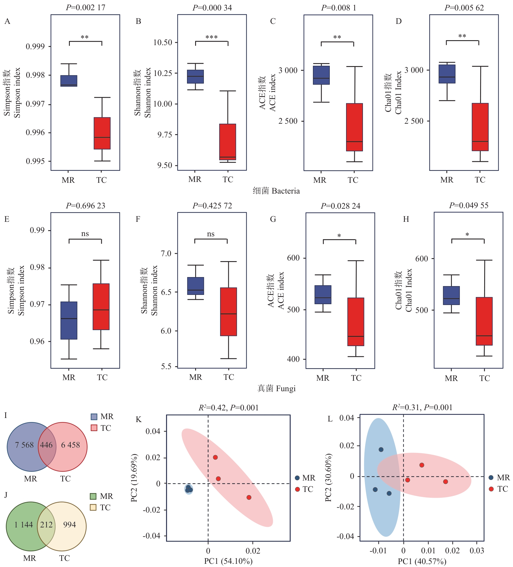 Fig. 2 Diversity of bacterial and fungal communities in rhizosphere soil under different planting patternsA: Bacterial Simpson index. B: Bacterial Shannon index. C: Bacterial Ace index. D: Bacterial Chao1 index. E: Fungal Simpson index. F: Fungal Shannon index. G: Fungal ACE index. H: Fungal Chao1 index. I: Bacterial Venn diagram. J: Fungi Venn diagram. K: Bacteria PCA analysis. l: Fungal PCA analysis. ***: P<0.001
