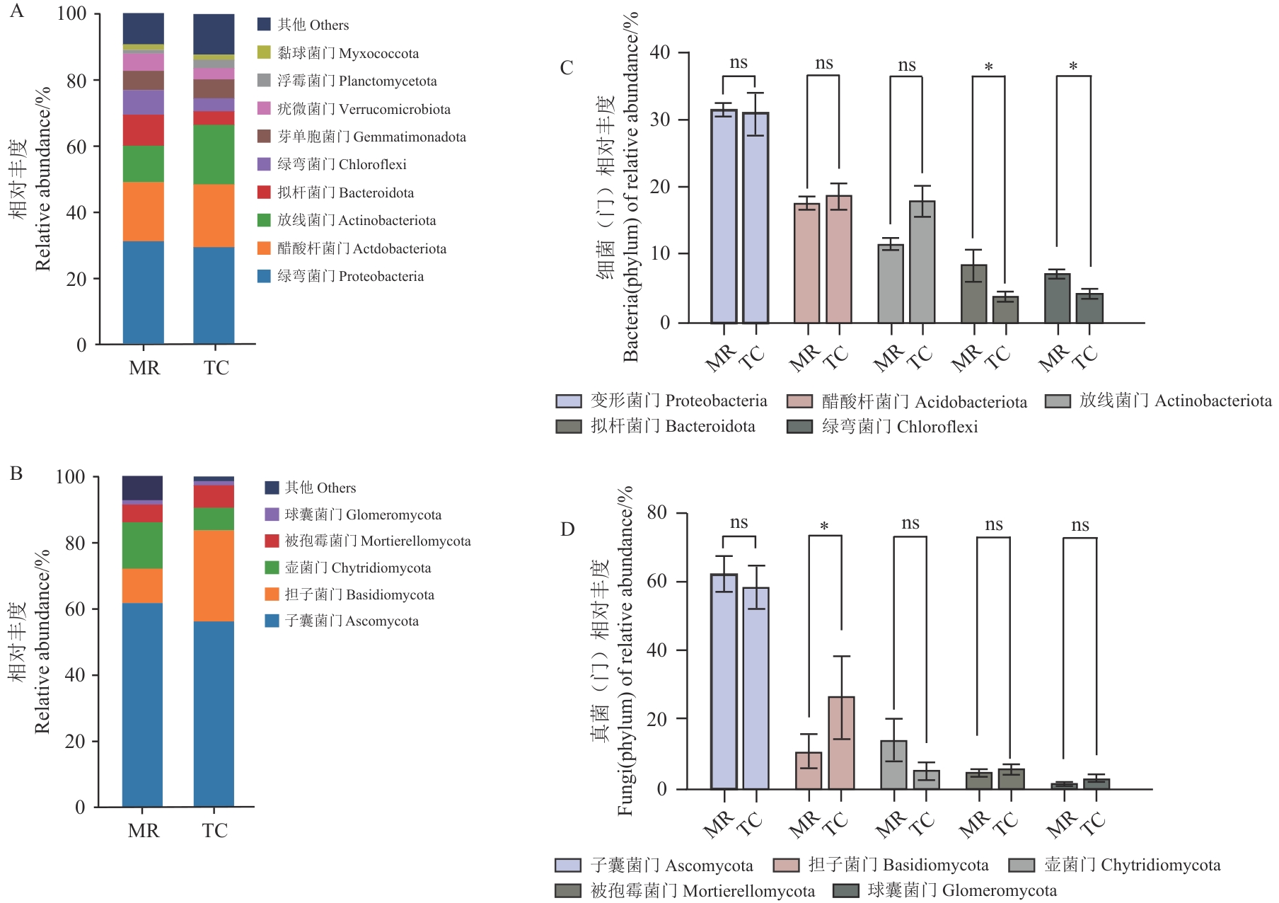 Fig. 3 Relative abundance of bacteria and fungi and differential species at the phylum level under different planting patternsA: Relative abundance of bacteria. B: Relative abundance of fungi. C: Bacterial differential species. D: Fungal differential species