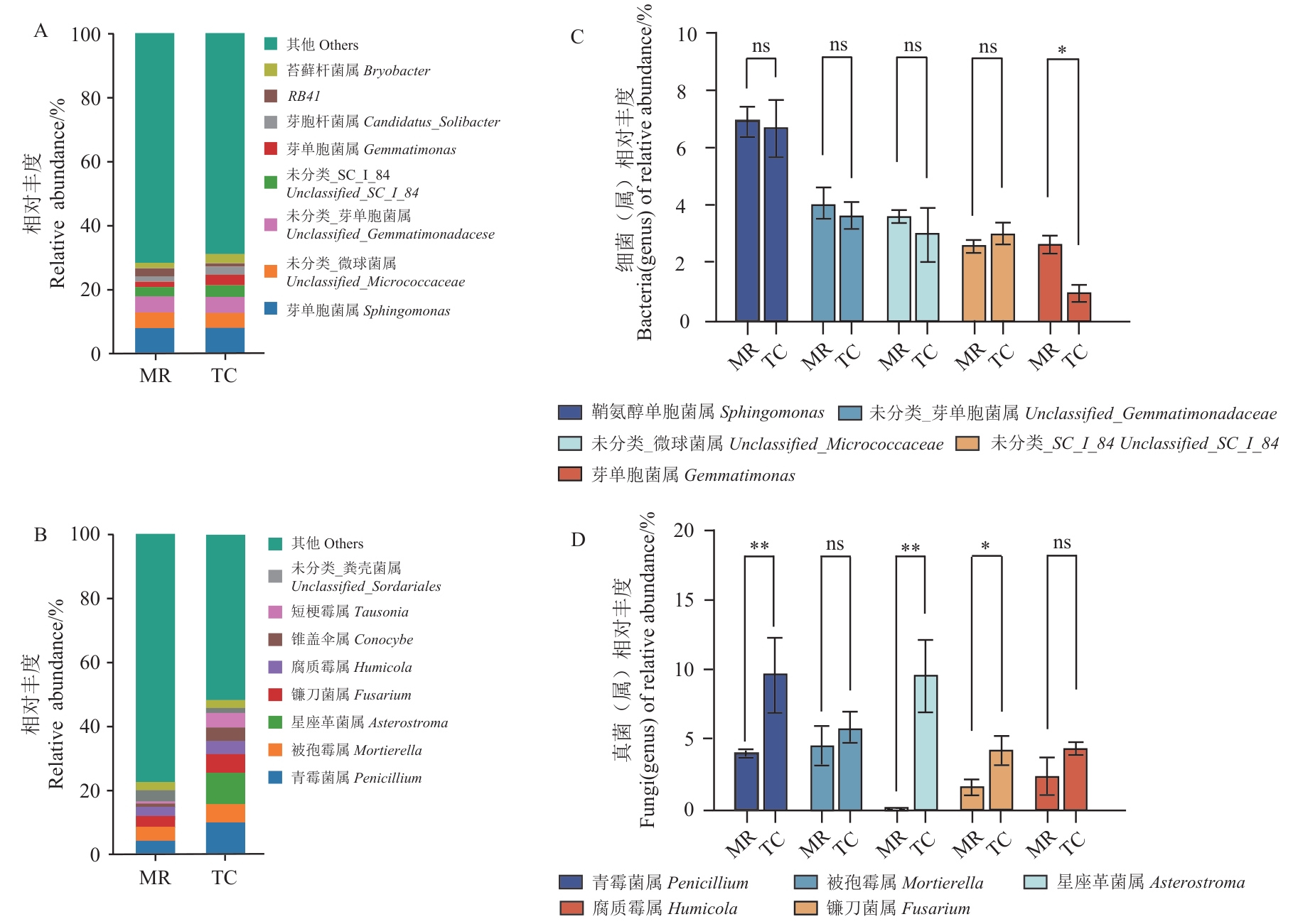 Fig. 4 Relative abundance of bacteria and fungi and differential species at the subordinate levels of different planting patternsA: Relative abundance of bacteria. B: Relative abundance of fungi. C: Bacterial differential species. D: Fungal differential species