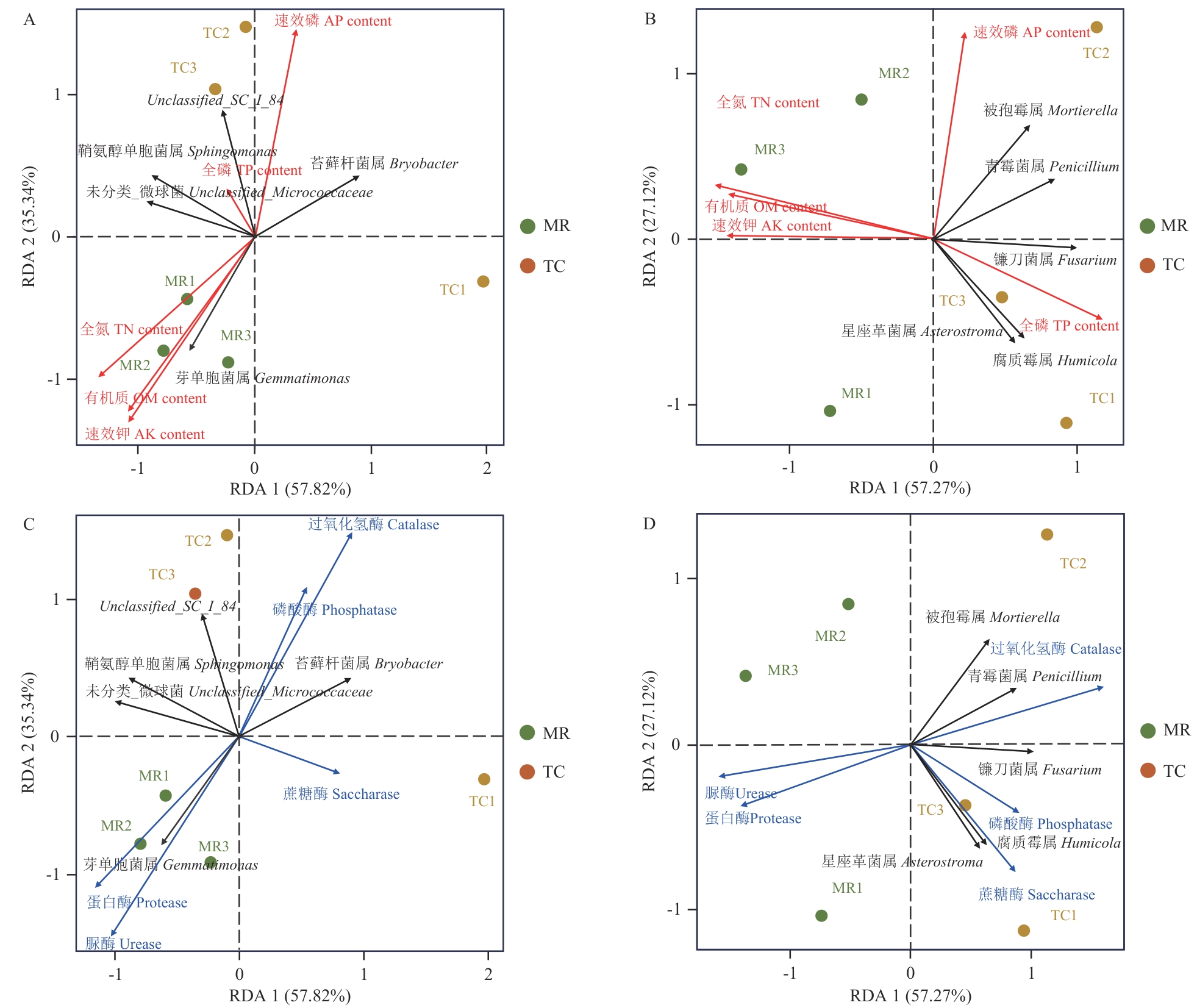 Fig. 5 Relationship between environmental factors and microbial communities under different planting patternsA: Redundancy analysis of bacterial level and soil nutrients. B: Redundant analysis of fungal genus level and soil nutrients. C: Redundancy analysis of bacterial level and enzyme activity. D: Redundant analysis of fungal genus level and enzyme activity