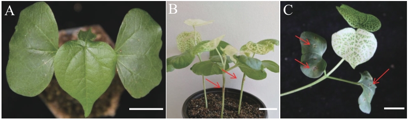 Fig. 1 Photobleaching phenotype of cotton seedling after VIGS treatmentA: Uninfected cotton seedling. B: Cotton plants of 10 d after stem injection at 4 d of age. C: Cotton plants of 10 d after cotyledon injection at 7 d of age. Bar=2 cm