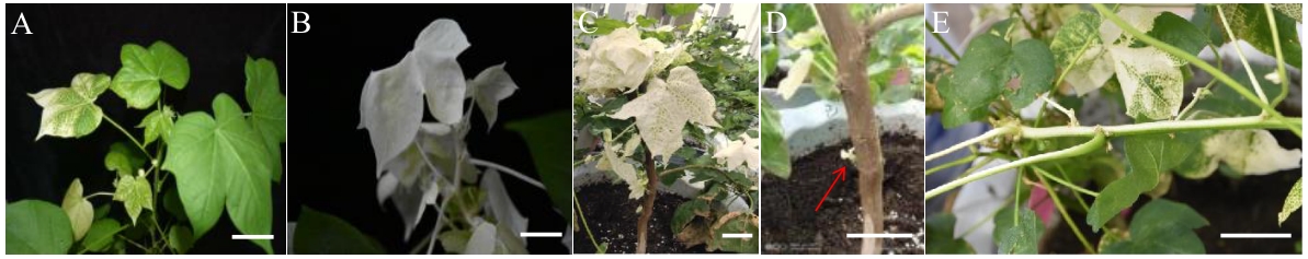 Fig. 2 Photobleaching phenotype of cotton plants after VIGS treatmentA: Phenotype of cotton plants at 3 weeks after VIGS injected to the cotton stem. B: Phenotype of cotton at 6 weeks after VIGS injected to cotton stem. C: The contrast between photobleaching leaves and old green leaves. D: Photobleaching downward. E: Coexistence of photobleaching and green on stem. Bar=10 cm