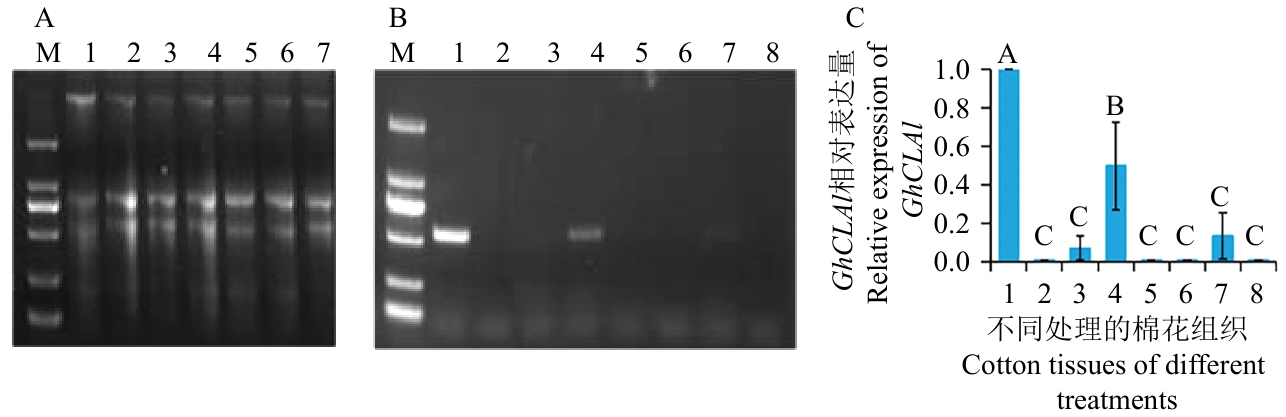 Fig. 5 Identification of the GhCLA1 gene silence in cottonA: The electrophoresis result of cotton total RNA. B: The GhCLA1 gene silenced identification results by RT-RCR. C: The GhCLA1 gene silenced identification results by RT-qRCR. The capital letters indicate that the differences reached the highly significant level (P<0.01). M: 2 000 bp marker. 1: True leaf of cotton seedling untreated by VIGS. 2: The true photobleaching leaf at 10 d after VIGS treatment to seedling stems. 3: Coexisting photobleaching and green leaf at 10 d after VIGS treatment to seedling stems. 4: Normal leaf of cotton plant untreated by VIGS. 5: Completely photobleaching leaf at 2 months after VIGS treatment of plant stems. 6: Completely photobleaching stem at 2 months after VIGS treatment of plant stems. 7: Stems while coexisting of photobleaching and green leaves at 2 months after VIGS treatment of plant stems. 8: Blank control