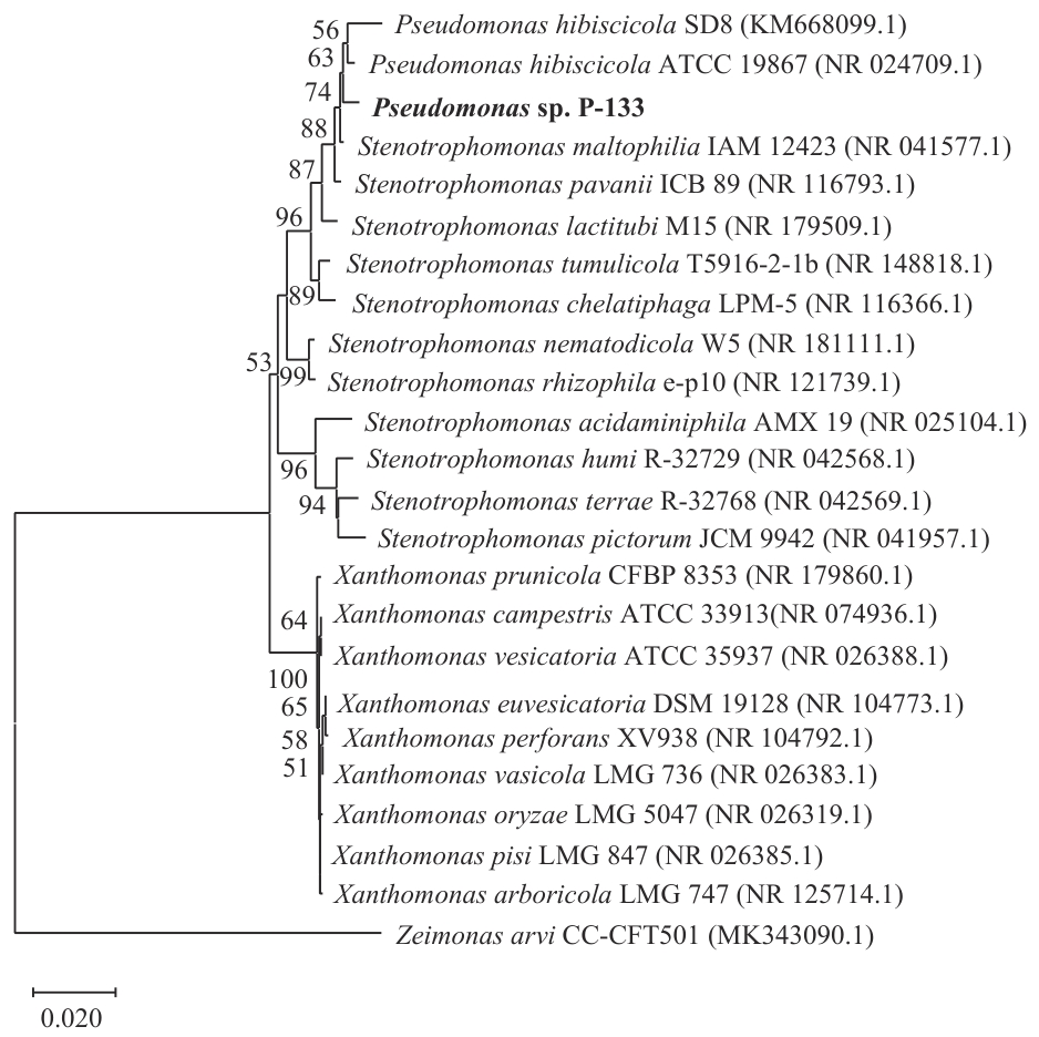 Objective To isolate and screen protease-producing bacteria from sauerkraut juice, clarify the species classification status of the strains, optimize the fermentation enzyme production process, enrich the resources of protease strains, and improve the efficiency of fermentation enzyme production. Method Using the sauerkraut juice of Chinese cabbage in a sauerkraut workshop as the isolation source, the ten-fold layer dilution method was used to screen the casein plate, and the folinol method was further re-screened to obtain the protease-producing strains. Morphological observation and 16S rRNA gene phylogenetic analysis were combined to complete the species identification. Single factor test was to optimize the composition and conditions of the fermentation medium, and the response surface method was further to optimize the enzyme-producing process for improving the efficiency of enzyme production. Result A total of 15 protease-producing strains were obtained by initial screening, and strain P-133 with acidic, neutral and alkaline protease abilities was obtained by re-screening with forinol method. The acidic, neutral and alkaline protease activities were 1.00, 52.50 and 48.50 U/mL, respectively, and were identified as Pseudomonas sp. The results via single factor and response surface tests showed that the optimal conditions for enzyme production of strain P-133 were soluble starch 5.0 g/L, rapeseed meal 5.9 g/L, NaCl 3.3 g/L, K2HPO4 5.0 g/L, pH 7.8, temperature 28℃, inoculation volume 5%. and liquid-loading capacity 75 mL/250 mL. Under these conditions, the acidic, neutral and alkaline protease activities were 4.14, 185.19 and 177.30 U/mL, respectively, which were 4.14, 3.53 and 3.66 times higher than those before optimization. Conclusion Pseudomonas sp. P-133 with acidic, neutral and alkaline proteases is isolated and screened from sauerkraut juice. The activities of acidic, neutral and alkaline proteases were 4.14, 3.53 and 3.66 times higher than those before optimization, respectively.