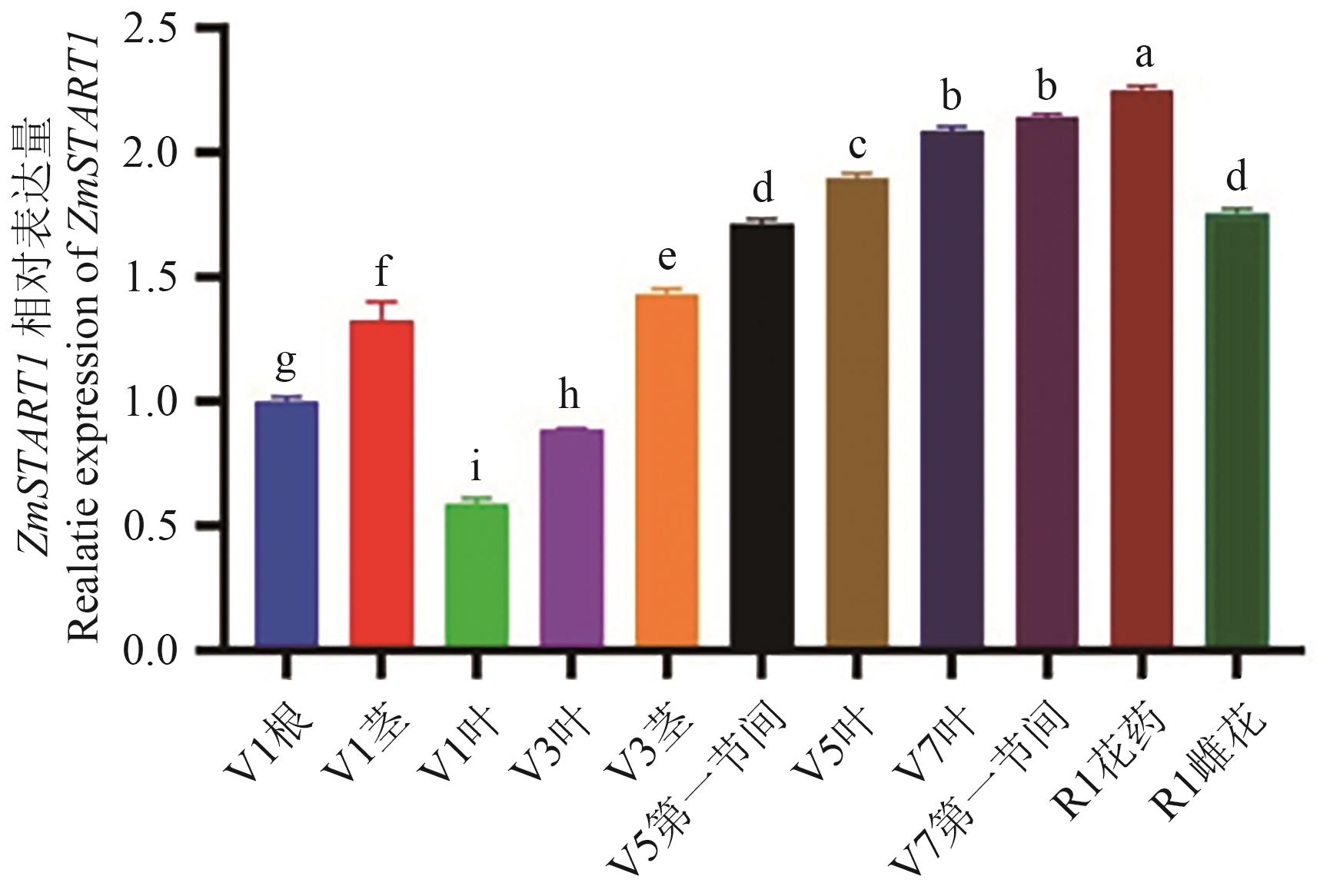 Fig. 3 Expressions of ZmSTART1 in different tissues of maizeV1: 1 true leaf development stage. V3: 3 true leaf development stage. V5: 5 true leaf development stage. V7: 7 true leaf development stage. R1: Silking stage of maize. Different lowercase letters indicate a significant difference ≤0.05. The same below