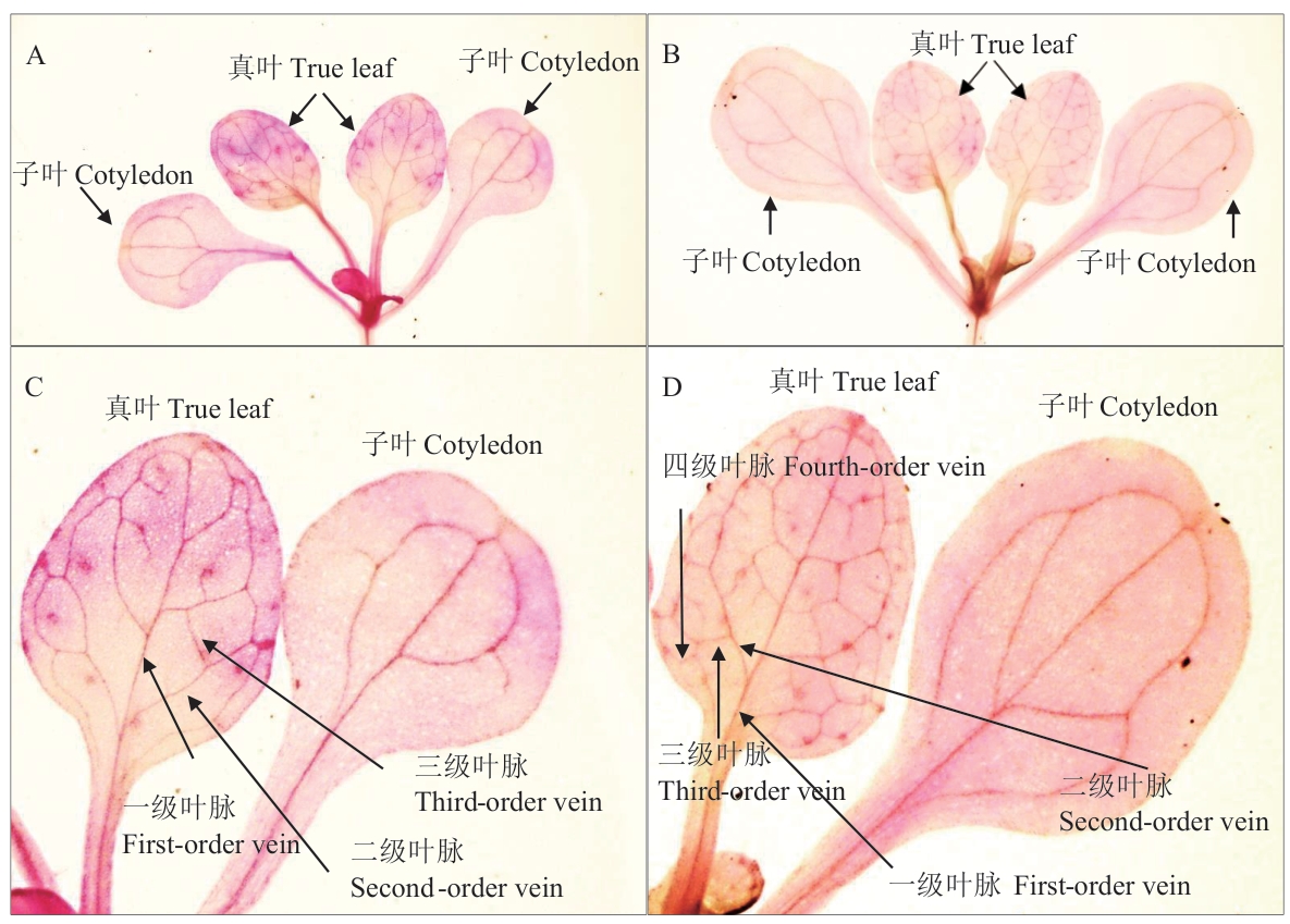 Fig. 7 Phenotype of the of ZmSTART1-overexpressed transgenic A.thaliana leaf veinA and B: The cotyledon and true leaf veins of wild type (A) and ZmSTART1-overexpressed transgenic Arabidopsis (B) respectively. C and D: The true leaf veins at all levels of wild type (C) and ZmSTART1-overexpressed transgenic Arabidopsis (D) respectively