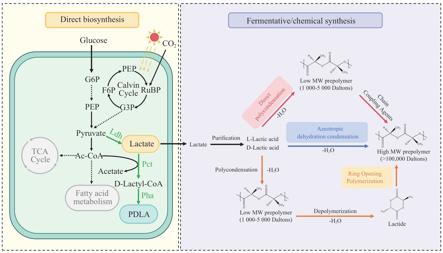 Fig. 3 Comparison of direct biosynthesis process and traditional biochemical hybrid process of PLAG6P: Glyceraldehyde 6-phosphate; PEP: phosphoenolpyruvate; Ac-CoA: acetyl-CoA; Ldh: lactate dehydrogenase; Pct: propionyl-CoA transferase; Pha: PHA synthase