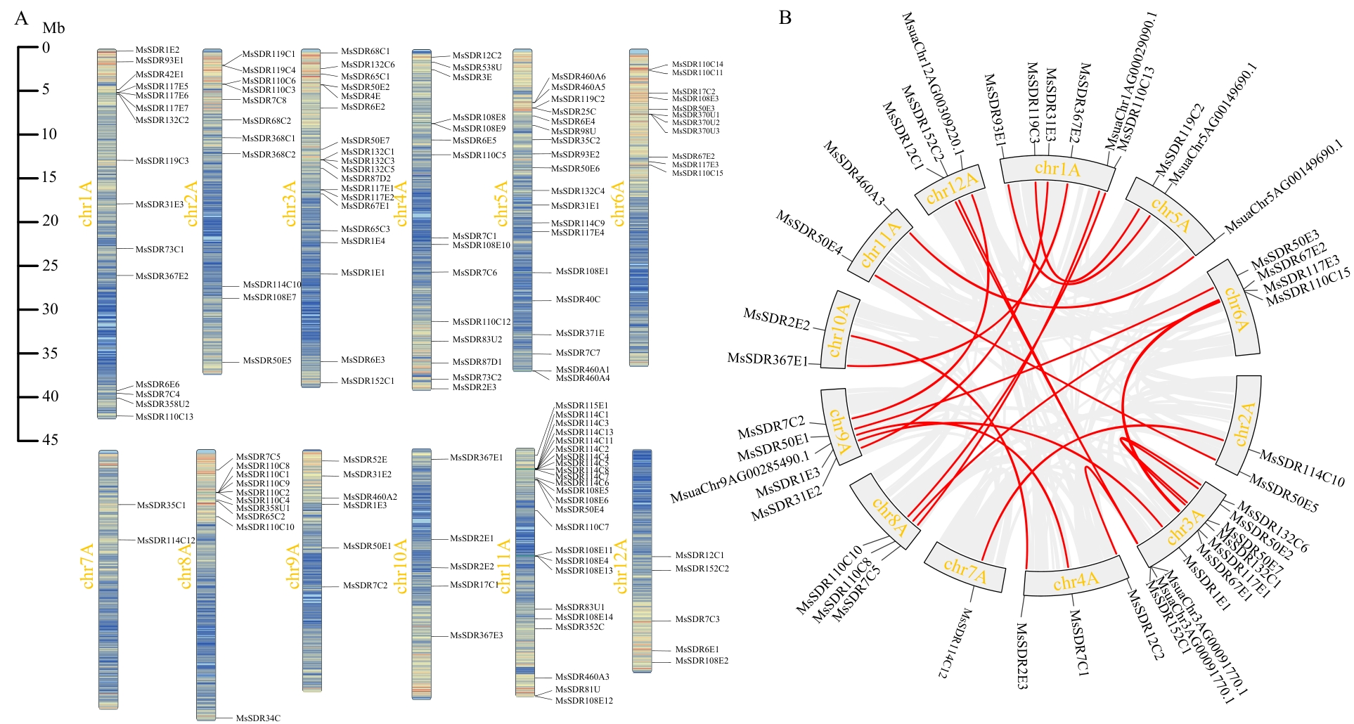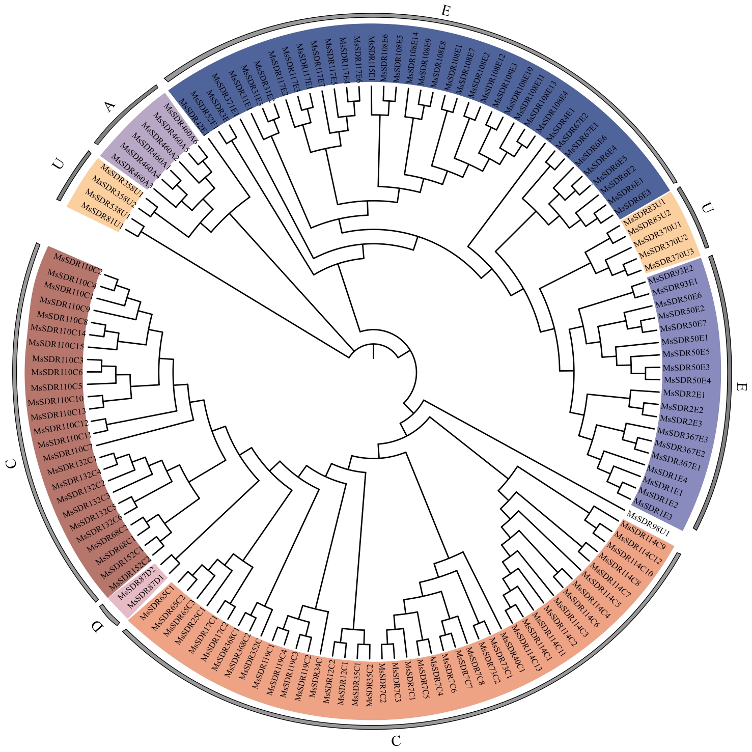 Objective Short-chain dehydrogenases/reductases (SDRs), belong to the NADPH-dependent oxidoreductase superfamily, represent an important gene family in plant metabolism. This study conducted a comprehensive identification and analysis of the SDR gene family in Mentha suaveolens 'Variegata', providing a theoretical basis for understanding the functions of SDR genes and their roles in menthol biosynthesis. Method Based on the genome data of M. suaveolens haplotype, bioinformatics methods were employed to identify the SDR gene family, and to analyze their physicochemical properties, conserved motifs, and chromosomal localization. Co-expression analysis was performed between SDR genes and important monoterpene compounds on the menthol synthesis pathway based on transcriptome and metabolome data. Additionally, RT-qPCR was performed to analyze expression patterns of MsSDR genes strongly correlated with monoterpene compounds. Result Total 142 MsSDR genes were identified in M. suaveolens, unevenly distributed across 12 chromosomes, encoding 232 to 765 amino acids. Phylogenetic analysis categorized MsSDR proteins into five types: classical (C), extended (E), non-classical (A), divergent (D)and unknown (U). Additionally, promoter sequence analysis of MsSDR identified the cis-acting elements associated with photo-response and stress responses. Gene expression profiles indicated that more than half of the MsSDRs were expressed in at least one tissue. Co-expression analysis revealed that 32 SDR genes presented a strong correlation with monoterpene compounds. Conclusion A comprehensive analysis of the M. suaveolensSDR gene family found that 142 MsSDRs genes were involved in multiple stages of its growth and development. Multiple MsSDRs were associated with monoterpene compounds in the menthol biosynthesis pathway, suggesting their potential involvement in menthol biosynthesis.
