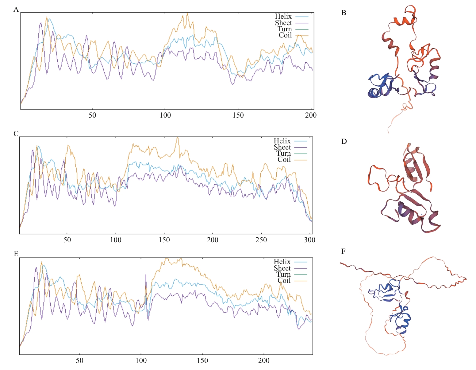 Fig. 4 Prediction of secondary and tertiary structures of LdBBX21, LdBBX22, and LdBBX24 proteinsA, C, E: Secondary structure prediction of LdBBX21, LdBBX22, and LdBBX24 protein. B, D, F: Tertiary structure prediction of LdBBX21, LdBBX22, and LdBBX24 protein