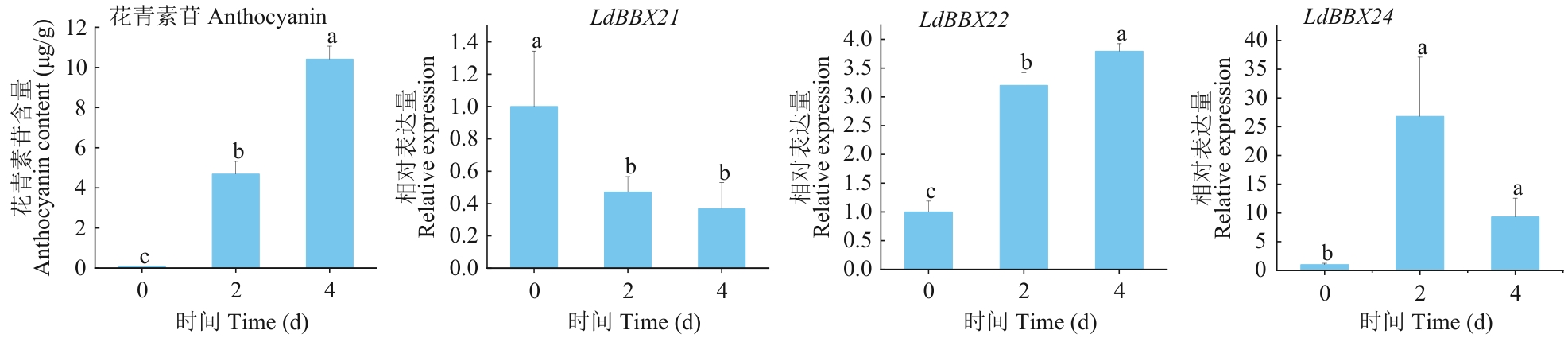 Fig. 9 Relative expressions and anthocyanin contents of LdBBX21, LdBBX22, and LdBBX24 genes under light treatment for 0, 2, and 4 dDifferent letters above columns indicate significant differences at P<0.05 level. The same below