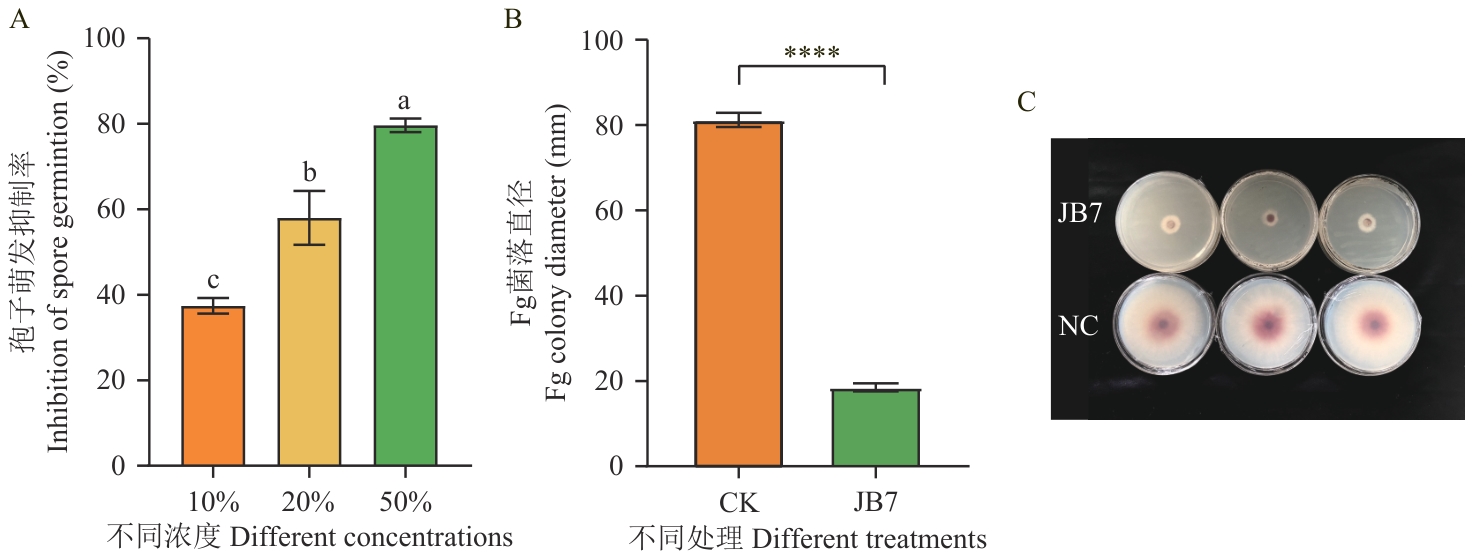 Fig. 1 Inhibitory effect of strain JB7 on Fusarium graminearum (Fg)A: The effect of different concentrations of CFS from strain JB7 on spore germination. B: The inhibitory effect of volatile compounds from strain JB7 on Fg. C: Plate of the inhibitory effect of volatile compounds from strain JB7 on Fg. The different lowercase letters indicate significant differences among treatments (P<0.05). **** indicates significant differences at P<0.000 1 . The same below