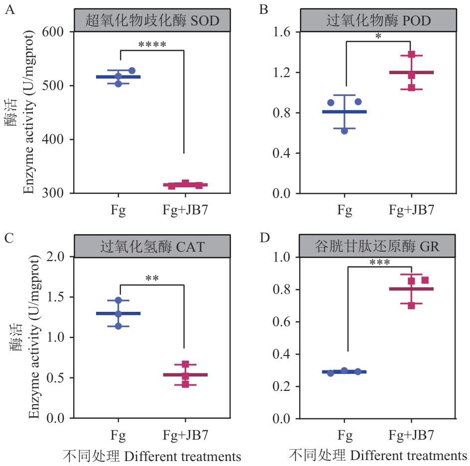 Fig. 2 Effects of CFS from strain JB7 on the antioxidant enzyme activities of Fg mycelia*, **, and *** indicate significant differences at P<0.05, P<0.01, and P<0.001, respectively. The same below