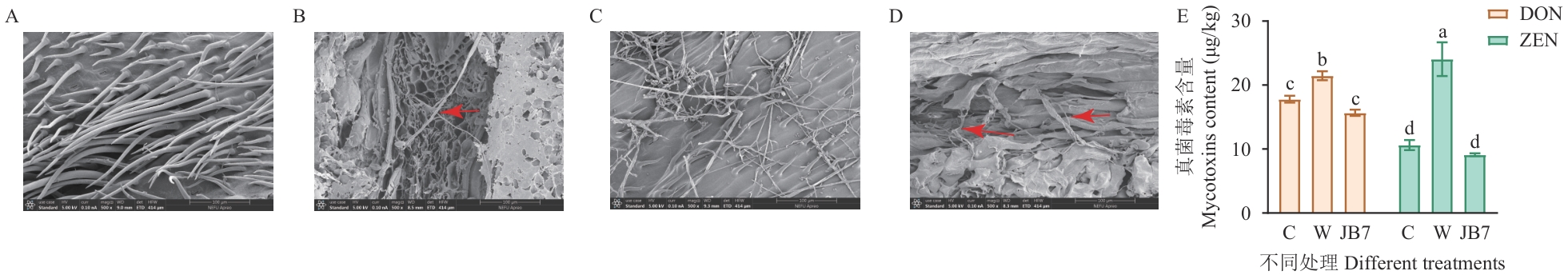 Fig. 5 Colonization of Fg in wheat ears and its mycotoxin secretionA: Profile map of glumes wheat ears in JB7 treatment. B: Profile map of inside tissues in JB7 treatment. C: Profile map of glumes wheat ears in water treatment. D: Profile map of inside tissues in water treatment. E: Mycotoxin content in wheat ears. The arrows indicate the distribution of the Fg mycelium