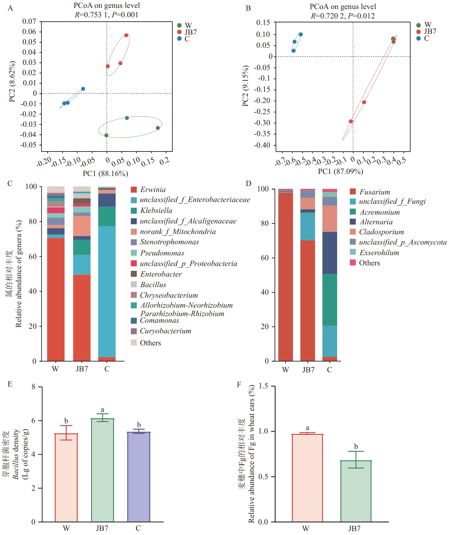 Fig. 6 Effects of strain JB7 on microbial community structure in wheat earsA: Principal coordinate analysis of bacterial community based on Bray-Curtis distance. B: Principal coordinate analysis of fungal community based on Bray-Curtis distance. C: Relative abundance of bacterial genera in different treatments. D: Relative abundance of fungal genera in different treatments. E: Absolute abundance of Bacillus in wheat ears. F: Relative abundance of Fg in wheat ears