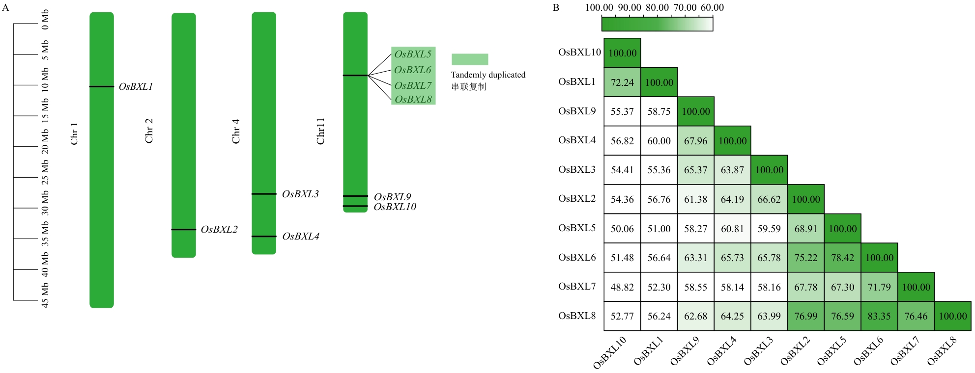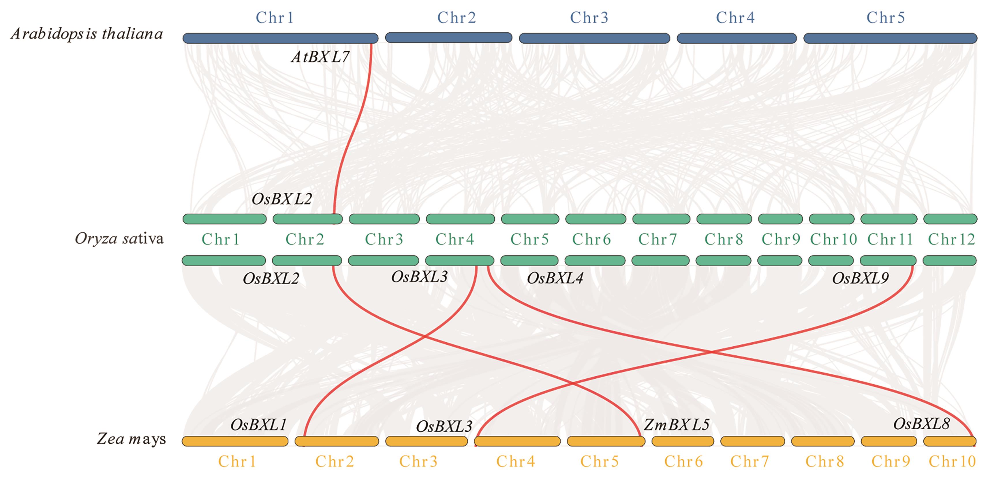 Objective BXL (β-D-xylosidase) belongs to the third family of glycoside hydrolases, which catalyzes the degradation of xylan in the cell wall, and plays a key role in regulating plant growth and development as well as abiotic stress response. Evolutionary and expression analysis of the OsBXL gene family will facilitate further exploration of their functions in rice. Method Bioinformatic technologies were used for analyzing the phylogenetic relationships, replication events, gene structure, conserved motifs, and tissue expression profiles of OsBXLs, and fluorescence quantitative PCR was used to investigate the expression pattern of OsBXLs under abiotic stress and hormone treatments. Result There are 10 members in rice BXL gene family, which can be divided into three subfamilies, with Group III specific to monocots. The gene structures and structural domains of OsBXLs within each group showed a high similarity. Gene location analysis indicated that OsBXL family members were unevenly distributed on 4 chromosomes, with OsBXL5/6/7/8 on chromosome 4 in a gene cluster. Transcriptome data revealed that OsBXL1/2/3/4/8 showed high expressions in a majority of detected tissues/organs, while OsBXL5/6/7/10 were expressed at low levels. Notably, the expressions of OsBXL7/10 were significantly high at the certain stage during the maturation of young inflorescence and seed. Moreover, three haplotypes of OsBXL7 were identified in the natural population, and significant differences in grain length, width, and thousand-grain weight were observed among different haplotypes. Fluorescence quantitative PCR revealed different expression patterns of OsBXLs under drought, saline-alkali, abscisic acid and methyl jasmonate treatments. Conclusion The OsBXL gene family is highly conserved, OsBXL7 is possibly involved in regulating rice grain size, while OsBXL1/3 simultaneously respond to salt-alkali stress and methyl jasmonate treatment. Together, these results provide a key guide for future functional analyses of OsBXL genes in rice.
