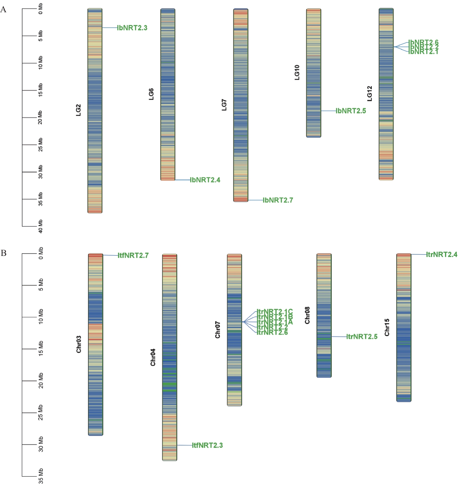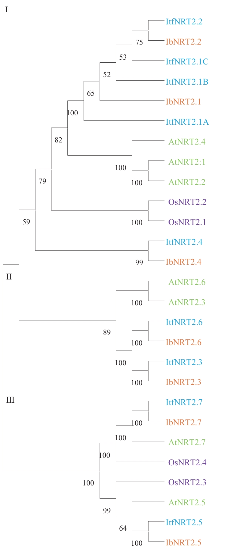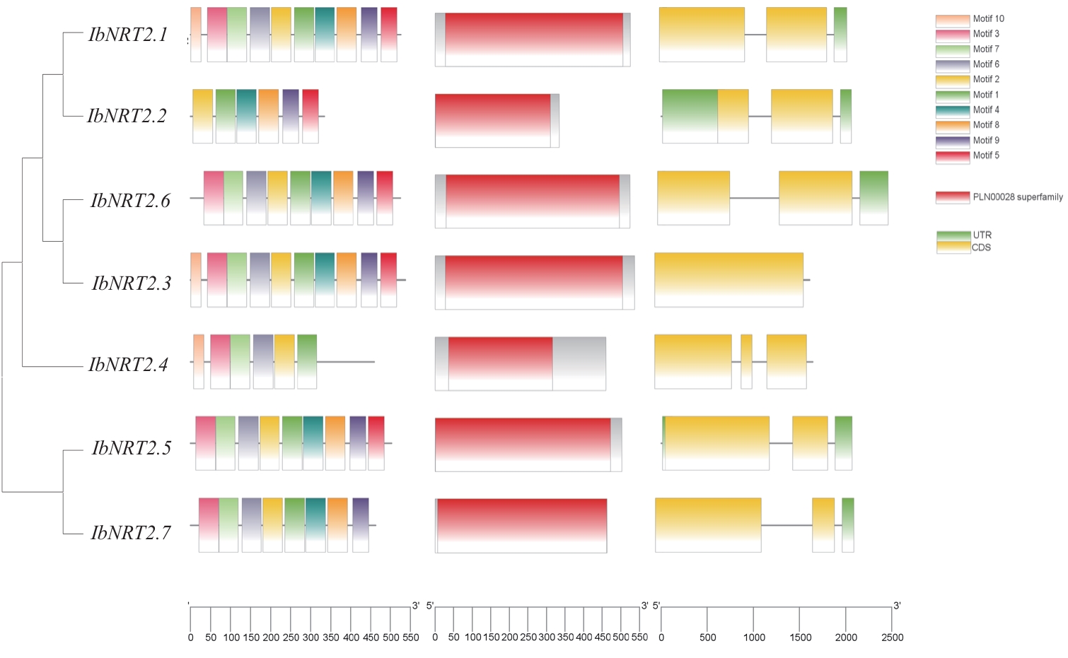 Objective To identify the high-affinity nitrate transporter NRT2 family members of sweet potato (Ipomoea batatas (L.) Lam.), and to analyze the physicochemical properties, structure and expression analysis under different stresses, thus providing theoretical support for the functional identification of NRT2 family members in sweet potato. Method The IbNRT2 gene members were systematically identified by bioinformatics, transcriptome analysis and low-nitrogen phenotype screening using NCBI and sweet potato genome databases, and the gene structure, conserved motifs and expression characteristics were analyzed. Result Seven IbNRT2 genes were identified in the whole genome of sweet potato. The results of physicochemical property analysis showed that the residual number of amino acids encoded by the members of the IbNRT2 family was 462-536, the theoretical isoelectric points were greater than 7, and all the encoded proteins were hydrophobic proteins. Seven IbNRT2 and nine closely related wild diploid (Ipomoea trifida) ItfNRT2 genes were distributed on 5 chromosomes. Phylogenetic tree analysis showed that the seven IbNRT2 family members were divided into three subgroups, and sweet potato was the most closely related to the wild diploid. The cis-actingelement analysis showed that there were numerous environmental and hormone response elements in the promoter region of IbNRT2 gene, among which the light response element was the most. The intraspecific collinearity relationship of sweet potato showed that there were two pairs of collinearity between the seven IbNRT2 genes. The results of interspecific collinearity showed that 7 pairs of collinearity were formed between sweet potato and wild diploid ItfNRT2 genes, and 4 pairs of collinearity were formed with ArabidopsisAtNRT2s. The results of tissue and salt stress expression analysis showed that IbNRT2.7 was widely expressed, with the highest expression in the seeds and leaves, and the expression was up-regulated by salt stress. IbNRT2.1 and IbNRT2.2 were mainly expressed in the roots and down-regulated by salt stress. RT-qPCR analysis of different nitrogen-treated sweet potato varieties showed that IbNRT2.1 and IbNRT2.2 were most significantly induced by low nitrate, and the induced expression folds of IbNRT2.1 and IbNRT2.2 were more pronounced in nitrogen-efficient sweet potato varieties (Chuanshu 221, Chuanshu 228, Xichengshu 007) than in nitrogen-inefficient sweet potato varieties (Pushu 32, Mianzi 9). Conclusion Seven IbNRT2 genes are identified in sweet potato, and the expression patterns of IbNRT2 vary in different parts, salt stress and low nitrogen stress, which lays a foundation for further study of the function of IbNRT2 in different parts.