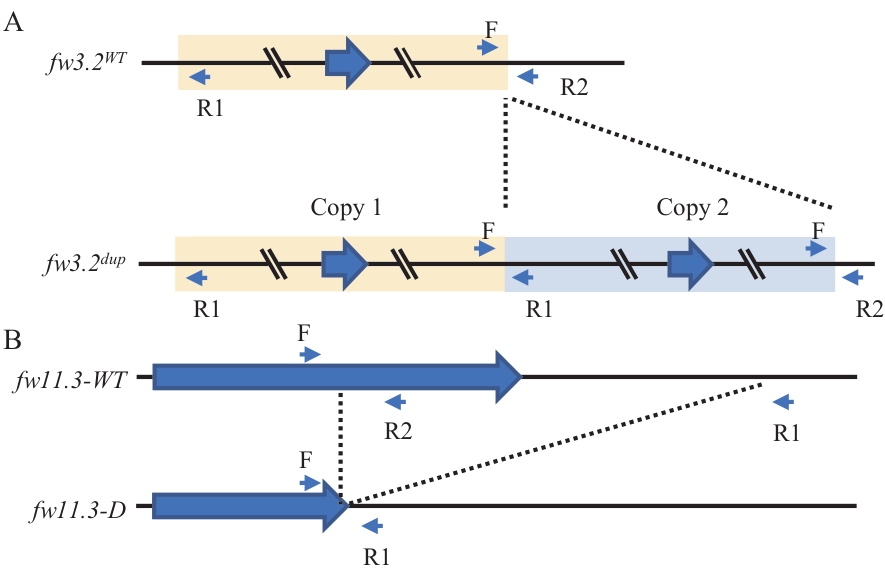 Fig. 1 Schematic diagram of the Fw3.2 (A) and Fw11.3 (B) gene structures and primer locationsfw3.2WT refers to the single-copy allele of the Fw3.2 gene, while fw3.2dup refers to the duplicated allele of the Fw3.2 gene. fw11.3-WT refers to the wild-type allele ofthe Fw11.3 gene, and fw11.3-D indicates the allele with a large fragment deletion in the 3′ region of the Fw11.3 gene. The same below