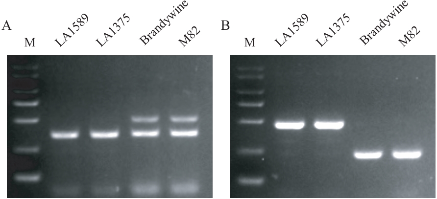 Fig. 2 Polymorphic primer detection for Fw3.2 (A) and Fw11.3 (B) in different tomato materialsM: Marker. LA1589 and LA1375 are S. pimpinellifolium (PIM) accessions, while Brandywine and M82 are big-fruited S. lycopersicum (BIG) accessions