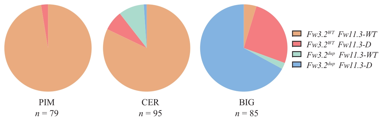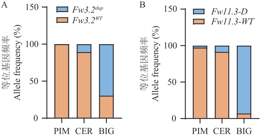 Fig. 3 Allele frequency analysis of Fw3.2 (A) and Fw11.3 (B)A: PIM: S. pimpinellifolium. CER: S. lycopersicum var. cerasiforme. BIG: Big-fruited S. lycopersicum. The same below